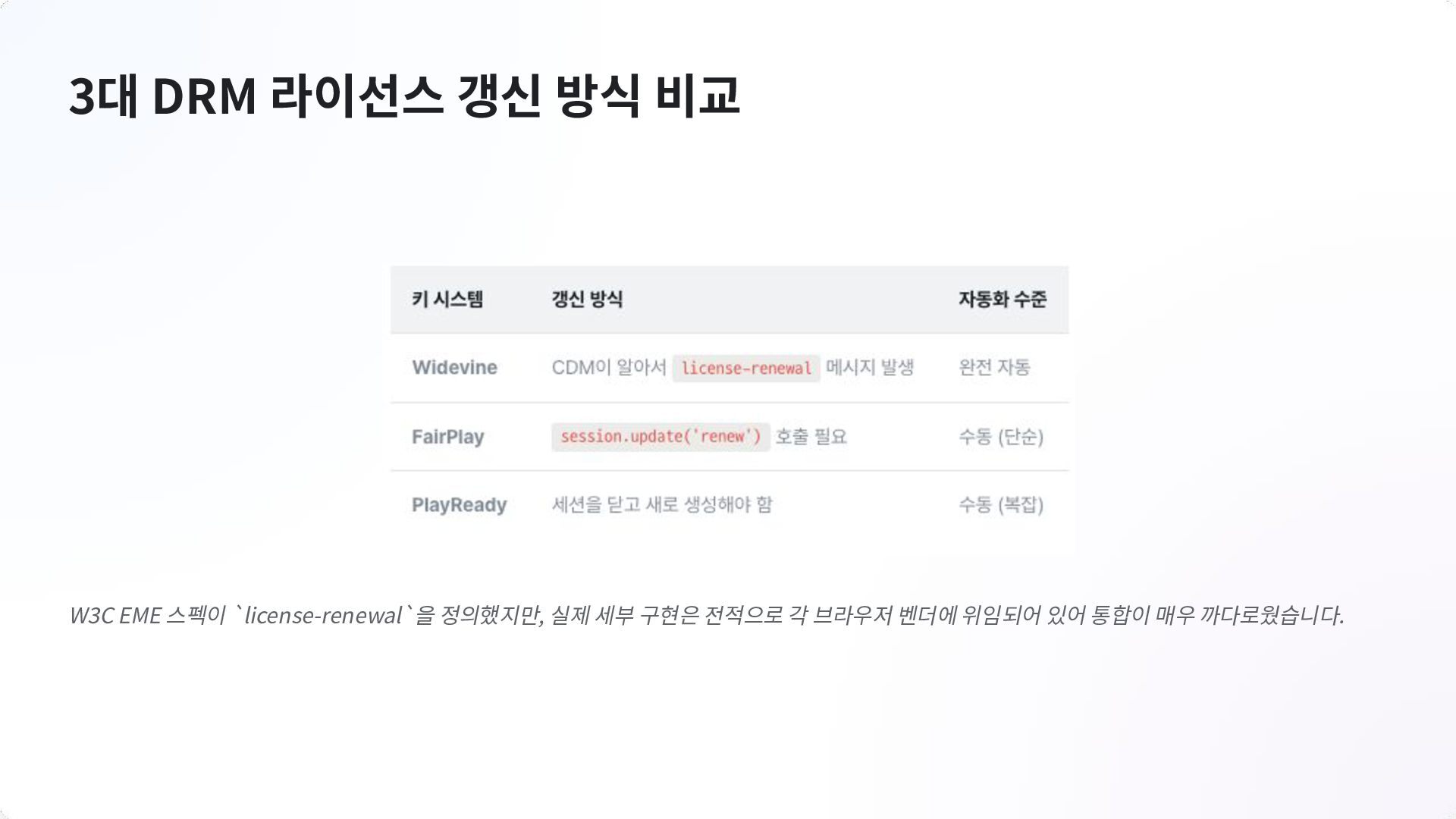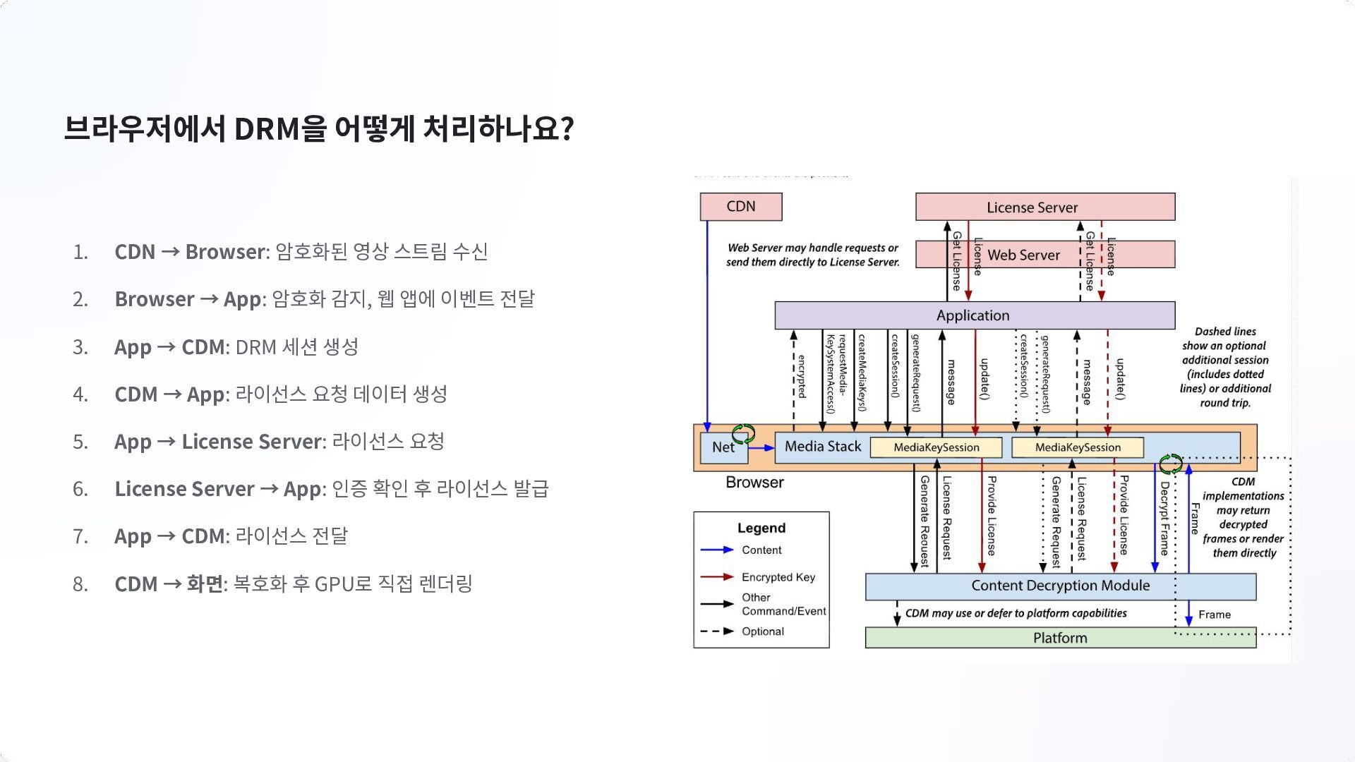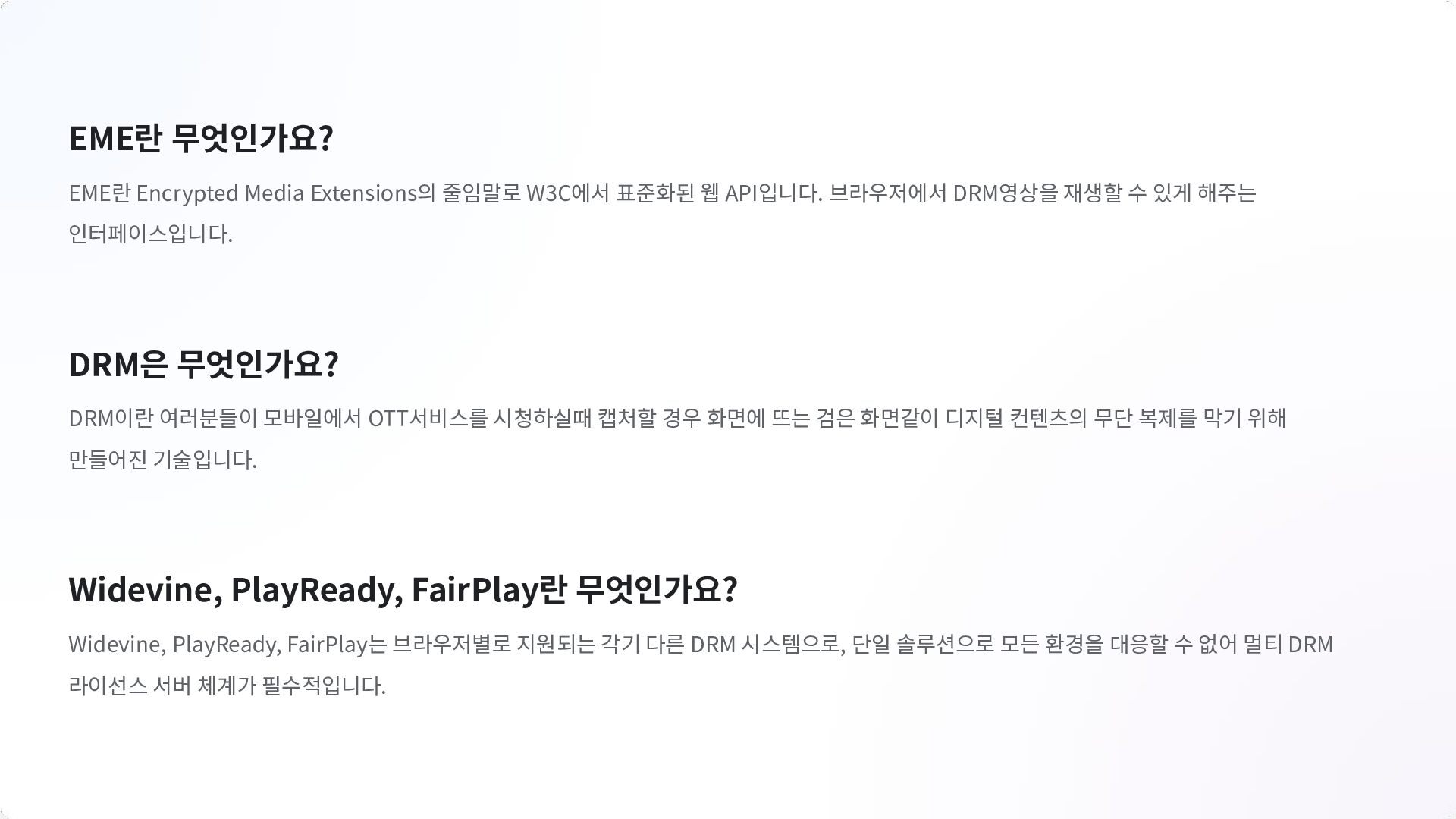 API입니다. 브라우저에서 DRM영상을 재생할 수 있게 해주는 인터페이스입니다. DRM은 무엇인가요? DRM이란 여러분들이 모바일에서 OTT서비스를 시청하실때 캡처할 경우 화면에 뜨는 검은 화면같이 디지털 컨텐츠의 무단 복제를 막기 위해 만들어진 기술입니다. Widevine, PlayReady, FairPlay란 무엇인가요? Widevine, PlayReady, FairPlay는 브라우저별로 지원되는 각기 다른 DRM 시스템으로, 단일 솔루션으로 모든 환경을 대응할 수 없어 멀티 DRM 라이선스 서버 체계가 필수적입니다.