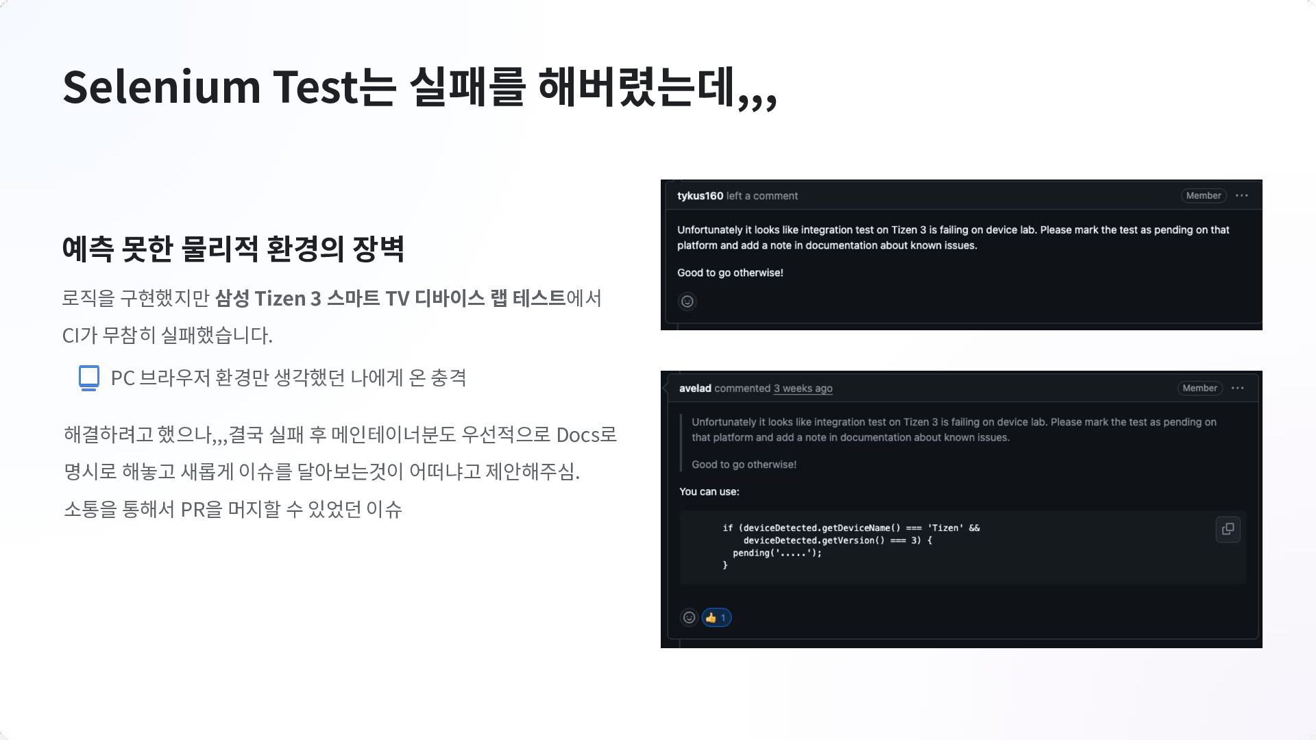스마트 TV 디바이스 랩 테스트에서 CI가 무참히 실패했습니다. 해결하려고 했으나,,,결국 실패 후 메인테이너분도 우선적으로 Docs로 명시로 해놓고 새롭게 이슈를 달아보는것이 어떠냐고 제안해주심. 소통을 통해서 PR을 머지할 수 있었던 이슈 PC 브라우저 환경만 생각했던 나에게 온 충격 Selenium Test는 실패를 해버렸는데,,,