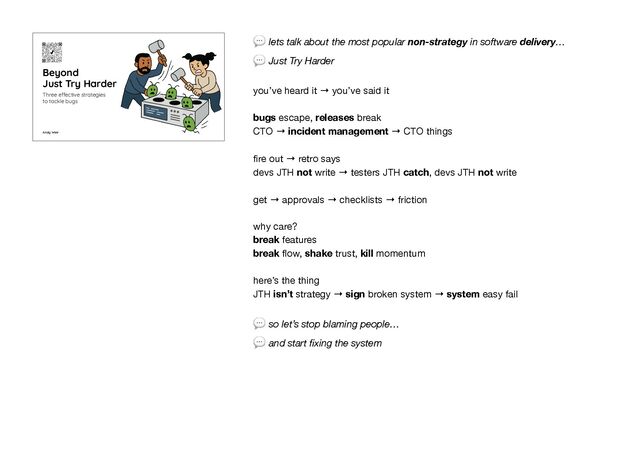Just the slides here: https://speakerdeck.com/andyrlweir/beyond-just-try-harder-three-effective-strategies-to-tackle-bugs-aotb