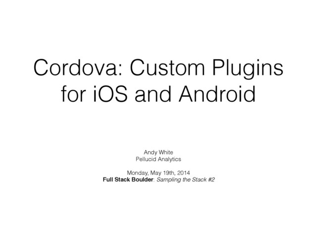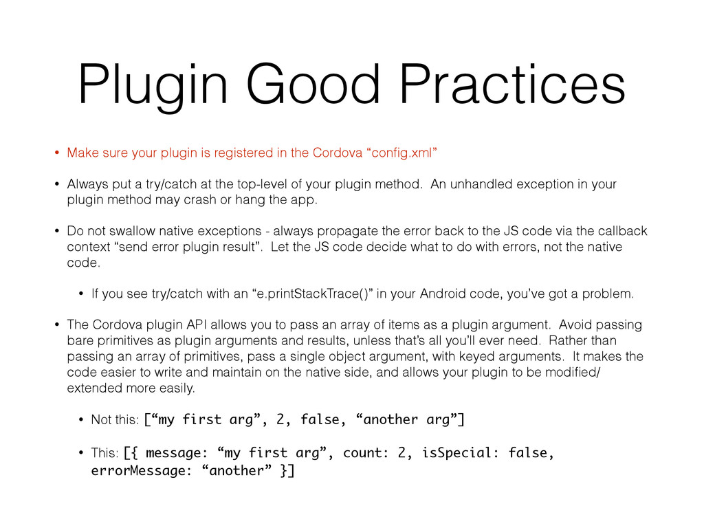 in the Cordova “config.xml” • Always put a try/catch at the top-level of your plugin method. An unhandled exception in your plugin method may crash or hang the app. • Do not swallow native exceptions - always propagate the error back to the JS code via the callback context “send error plugin result”. Let the JS code decide what to do with errors, not the native code. • If you see try/catch with an “e.printStackTrace()” in your Android code, you’ve got a problem. • The Cordova plugin API allows you to pass an array of items as a plugin argument. Avoid passing bare primitives as plugin arguments and results, unless that’s all you’ll ever need. Rather than passing an array of primitives, pass a single object argument, with keyed arguments. It makes the code easier to write and maintain on the native side, and allows your plugin to be modified/ extended more easily. • Not this: [“my first arg”, 2, false, “another arg”] • This: [{ message: “my first arg”, count: 2, isSpecial: false, errorMessage: “another” }]