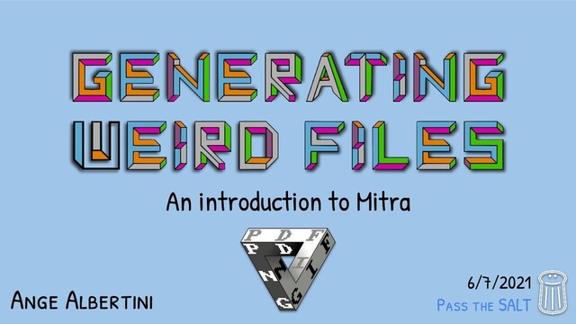 Detector Image, - Linux kernel x86 boot executable RW-rootFS, - ReiserFS V3.6 - Files-11 On-Disk Structure (ODS-52); volume label is ' ' - DOS/MBR boot sector - Game Boy ROM image (Rev.00) [ROM ONLY], ROM: 256Kbit - Plot84 plotting file - DOS/MBR boot sector - DOSFONT2 encrypted font data - Kodak Photo CD image pack file , landscape mode - SymbOS executable v., name: HNRO0\334\247\304\375]\034\236\243 - ISO 9660 CD-ROM filesystem data (raw 2352 byte sectors) - Nero CD image at 0x4B000 ISO 9660 CD-ROM filesystem data - High Sierra CD-ROM filesystem data - Old EZD Electron Density Map - Apple File System (APFS), blocksize 24061976 - Zoo archive data, modify: v78.88+ - Symbian installation file - 4-channel Fasttracker module sound data Title: "MZ`\352\210\360'\315!" - Scream Tracker Sample adlib drum mono 8bit unpacked - Poly Tracker PTM Module Title: "MZ`\352\210\360'\315!" - SNDH Atari ST music - SoundFX Module sound file - D64 Image - Nintendo Wii disc image: "NXSB\030(o\001" (MZ`\35, Rev.205) - Nintendo 3DS File Archive (CFA) (v0, 0.0.0) - Unix Fast File system [v1] (little-endian), last mounted on , ... - Unix Fast File system [v2] (little-endian) last mounted on , ... - Unix Fast File system [v2] (little-endian) last mounted on , … - ISO 9660 CD-ROM filesystem data (DOS/MBR boot sector) - F2FS filesystem, UUID=00000000-0000-0000-0000-000000000000, volume name "" - DICOM medical imaging data - Linux kernel ARM boot executable zImage (little-endian) - CCP4 Electron Density Map - Ultrix core file from 'X5O!P%@AP[4\PZX54(P^)7CC)7}$EICAR-STANDARD-ANTIVI... - VirtualBox Disk Image (MZ`\352\210\360'\315!), 5715999566798081280 bytes - MS Compress archive data - AMUSIC Adlib Tracker MS-DOS executable, MZ for MS-DOS COM executable for DOS - JPEG 2000 image - ARJ archive data - unicos (cray) executable - IBM OS/400 save file data - data This file is simultaneously detected as: - DOS EXE, COM and MBR - Zoo, ARJ, VirtualBox, MS Compress, 3DS - ISO, RAW ISO, Nero, PhotoCD - FastTracker, ScreamTracker, Adlib tracker, Polytracker, SoundFX - Apple, IBM, HP, Linux, Ultrix, Raid, ODS, Nintendo, Kodak - EZD, CCP4, Plot84, MAR, Dicom ... A polymock - a 190-in-1 yet empty f ile 24 00 10 20 30 40 50 60 70 80 … Many magics are at the start of the file. The file is mostly empty! It only contains magics to fake file types. output from file --keep-going 0 0x0 Gameboy ROM,, [ROM ONLY], ROM: 256Kbit 80 0x50 RAR archive data, version 5.x 88 0x58 lrzip compressed data 89 0x59 rzip compressed data - version 76.79... 114 0x72 xz compressed data 120 0x78 LZ4 compressed data ... output (150 sigs) from Binwalk https://github.com/corkami/pocs/tree/master/polymocks .M .Z 60 EA .j .P 01 07 19 04 00 10 .S .N .D .H .N .R .O .0 DC A7 C4 FD 5D 1C 9E A3 .R .E .~ .^ .N .X .S .B 18 28 6F 01 .P .K 03 04 .P .T .M .F .S .y .m .E .x .e .7 .z BC AF 27 1C .S .O .N .G 7F 10 DA BE 00 00 CD 21 .P .K 01 02 .S .C .R .S .R .a .r .! ^Z 07 01 00 .L .R .Z .I .P .L .O .T .% .% .8 .4 .R .a .r .! ^Z 07 00 00 00 .M .A .P . .( FD .7 .z .X .Z 00 04 22 4D 18 03 21 4C 18 .D .I .C .M .% .P .D .F .- .1 .. .4 . .o .b .j …