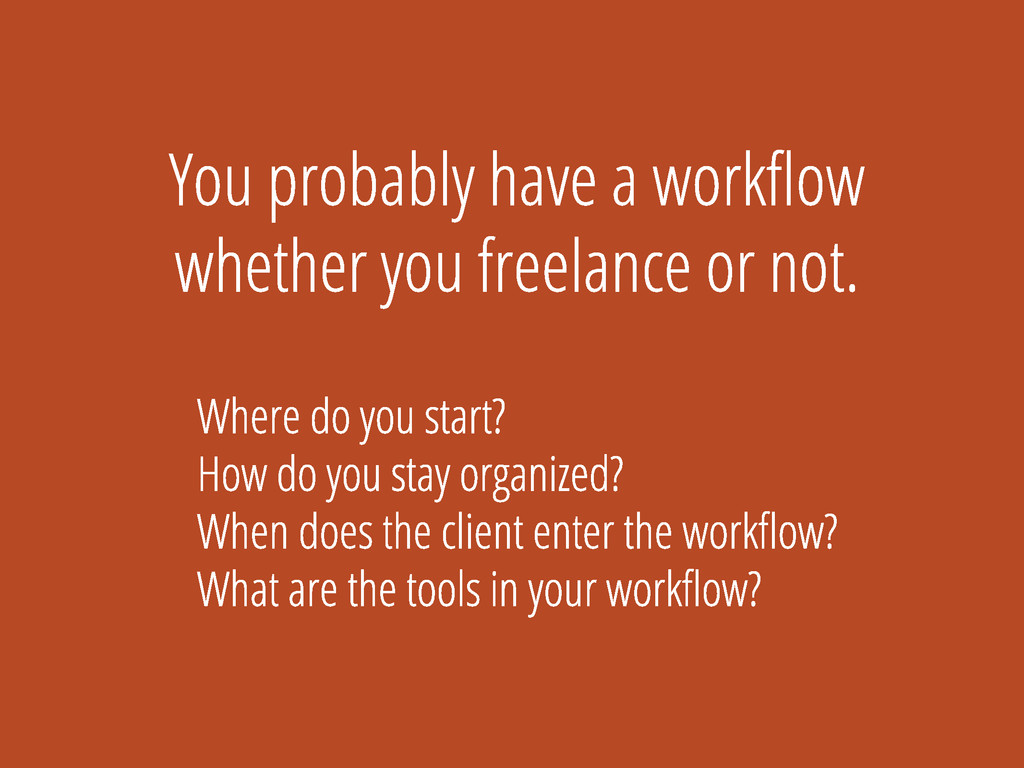 s t a r t ? H o w d o y o u s t a y o r g a n i z e d ? W h e n d o e s t h e c l i e n t e n t e r t h e w o r k fl o w ? W h a t a r e t h e t o o l s i n y o u r w o r k fl o w ? Y o u p r o b a b l y h a v e a w o r k fl o w w h e t h e r y o u f r e e l a n c e o r n o t .