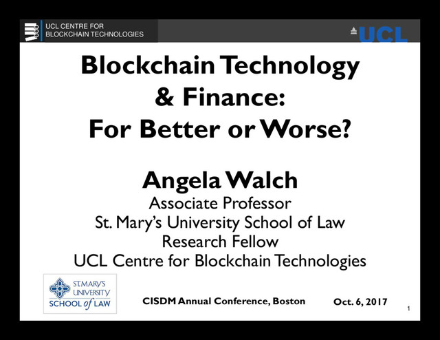 Professor St. Mary’s University School of Law Research Fellow UCL Centre for BlockchainTechnologies CISDM Annual Conference, Boston Oct. 6, 2017 1 UCL CENTRE FOR BLOCKCHAIN TECHNOLOGIES