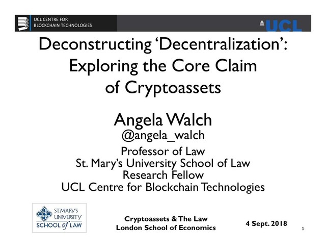 A core claimed feature of cryptoassets is that the systems that create them are ‘decentralized.’ This is said make them more resilient and to eliminate the need to trust in a central party. Indeed, the feature of ‘decentralization’ appears to now be relevant to the legal treatment of cryptoassets, as the SEC recently highlighted the decentralization of Ethereum and Bitcoin as a key factor in whether ether and bitcoin should be treated as securities. In this piece, I explore what ‘decentralization’ means in public blockchain networks, focusing on the fundamental actors in the system: software developers, transaction processors (miners), and nodes. I offer a theory of why ‘decentralization’ might be relevant from a legal perspective and analyze the implications of using such a fluid concept as a basis for legal determinations.