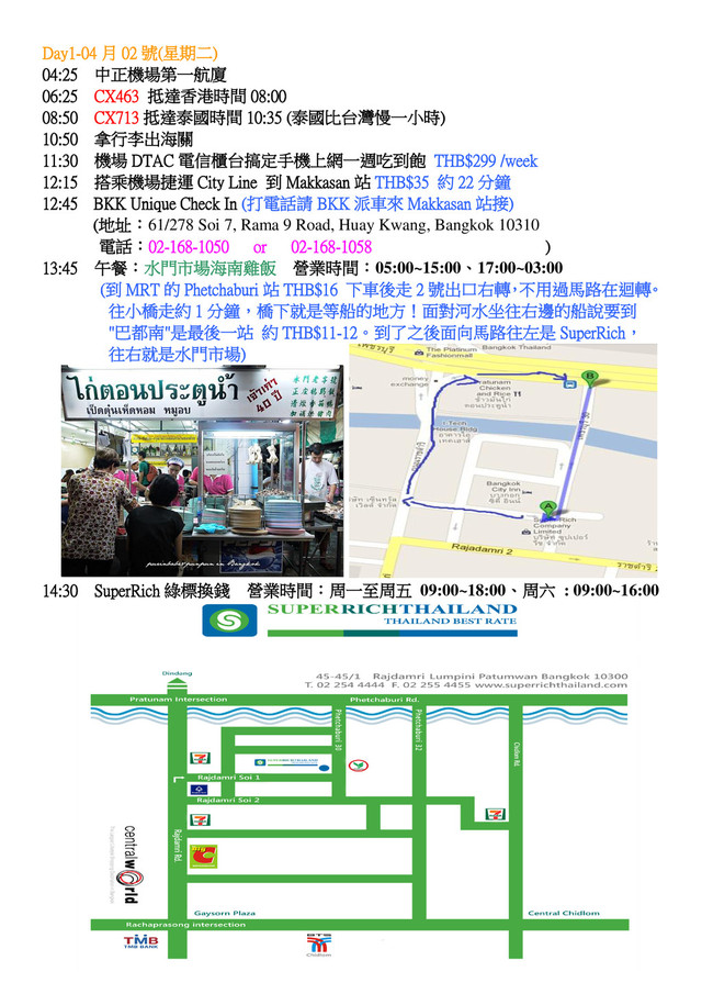 Papaya 傢俱行 地址:306 / 1 55 / 2, , , (1.搭計程車去約 THB$70~100 2.搭 BKK 免費 TukTuk 到 MRT 的 Phra Ram9 站然後坐到 Lat Phrao 站 THB$27 再換計程車 約 THB$40~60 結論:還是直接坐計程車就好了....崩潰) 12:00 恰圖恰市集 (搭計程車回 Lat Phrao 站 約 THB$40~60 再換搭 MRT 到 KamPhaeng Phet 站 2 號出口 共 4 站 THB$22 結論:因為市集人太多坐計程車會很塞 所以不好坐計程車直達....哭哭) 午餐自行在市集內解決 17:00~17:20 鐘樓集合 18:00 回 BKK 卸貨休息(搭 MRT 到 Phra Ram 站 2 號出口 THB$34 再請 BKK 來接) 19:30 Central Plaza(搭 BKK 免費 TukTuk 到 MRT 的 Phra Ram9 站就是了) 晚餐:Yum Saap 媽媽麵小吃專賣店 六樓 22:00 Tesco Lotus 賣場補貨 23:00 回 BKK Unique 休息 (散步回去) Day6- 04 月 07 號(星期日) 05:00 起床 06:00 Makkasan 站(請 BKK 幫忙預訂計程車) 06:30 Suvarnabhumi Airport (搭 City Line 到機場 THB$35 約 22 分鐘) 08:35 CX2700 抵達香港時間 12:25 13:35 CX466 抵達臺灣時間 15:15