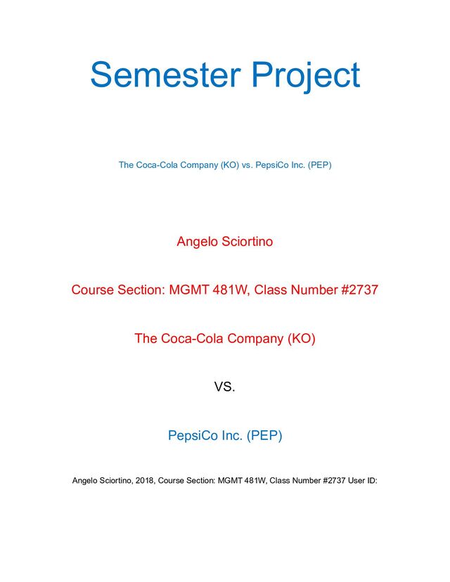 Angelo Sciortino Course Section: MGMT 481W, Class Number #2737 The Coca-Cola Company (KO) VS. PepsiCo Inc. (PEP) Angelo Sciortino, 2018, Course Section: MGMT 481W, Class Number #2737 User ID: