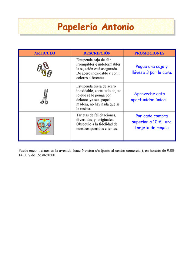 clip irrompibles e indeformables, la sujeción está asegurada. De acero inoxidable y con 5 colores diferentes. Pague una caja y llévese 3 por la cara. Estupenda tijera de acero inoxidable, corta todo objeto lo que se le ponga por delante, ya sea papel, madera, no hay nada que se le resista. Aproveche esta oportunidad única Tarjetas de felicitaciones, divertidas, y originales. Obsequio a la fidelidad de nuestros queridos clientes. Por cada compra superior a 10 €, una tarjeta de regalo Puede encontrarnos en la avenida Isaac Newton s/n (junto al centro comercial), en horario de 9:00- 14:00 y de 15:30-20:00