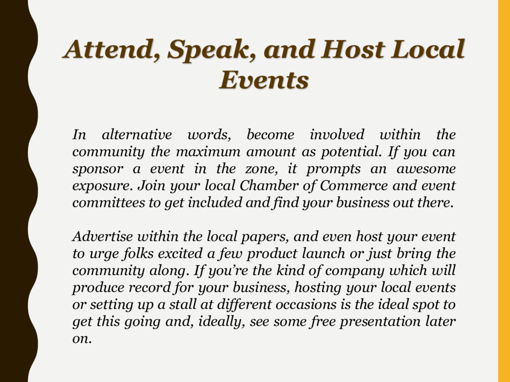 involved within the community the maximum amount as potential. If you can sponsor a event in the zone, it prompts an awesome exposure. Join your local Chamber of Commerce and event committees to get included and find your business out there. Advertise within the local papers, and even host your event to urge folks excited a few product launch or just bring the community along. If you’re the kind of company which will produce record for your business, hosting your local events or setting up a stall at different occasions is the ideal spot to get this going and, ideally, see some free presentation later on.