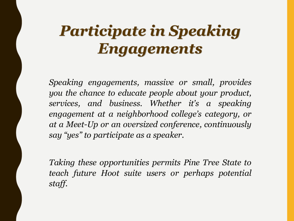you the chance to educate people about your product, services, and business. Whether it’s a speaking engagement at a neighborhood college’s category, or at a Meet-Up or an oversized conference, continuously say “yes” to participate as a speaker. Taking these opportunities permits Pine Tree State to teach future Hoot suite users or perhaps potential staff.