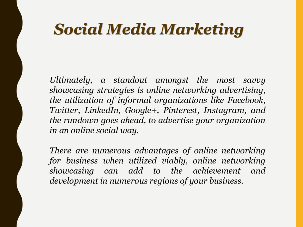 showcasing strategies is online networking advertising, the utilization of informal organizations like Facebook, Twitter, LinkedIn, Google+, Pinterest, Instagram, and the rundown goes ahead, to advertise your organization in an online social way. There are numerous advantages of online networking for business when utilized viably, online networking showcasing can add to the achievement and development in numerous regions of your business.