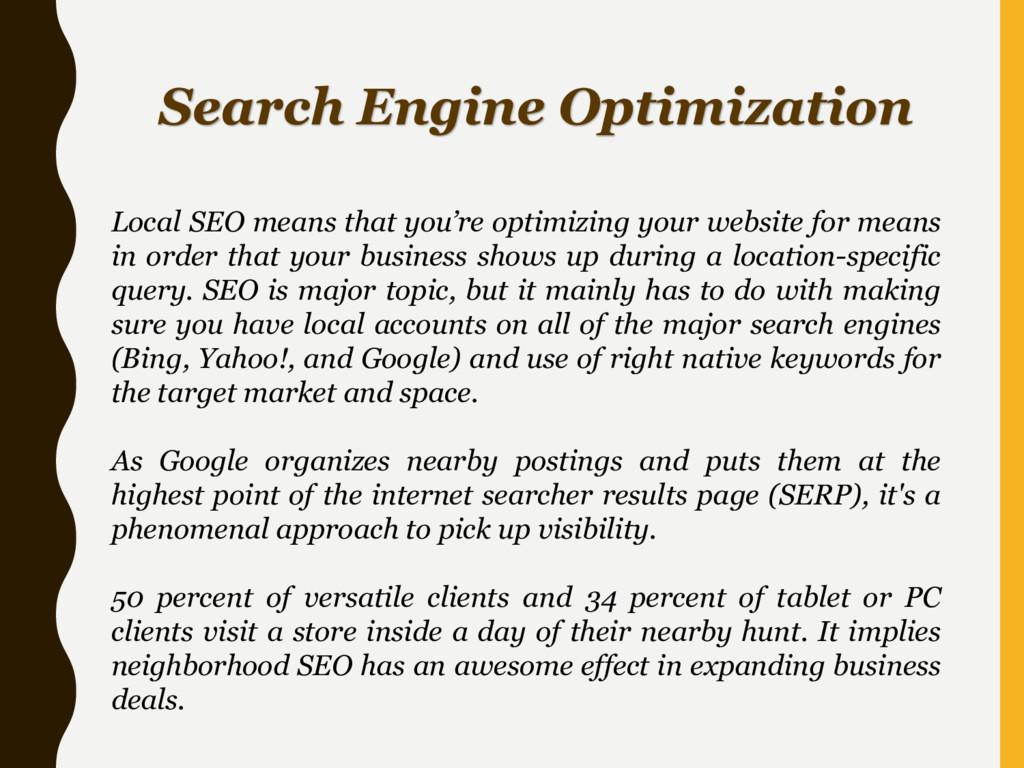 website for means in order that your business shows up during a location-specific query. SEO is major topic, but it mainly has to do with making sure you have local accounts on all of the major search engines (Bing, Yahoo!, and Google) and use of right native keywords for the target market and space. As Google organizes nearby postings and puts them at the highest point of the internet searcher results page (SERP), it's a phenomenal approach to pick up visibility. 50 percent of versatile clients and 34 percent of tablet or PC clients visit a store inside a day of their nearby hunt. It implies neighborhood SEO has an awesome effect in expanding business deals.