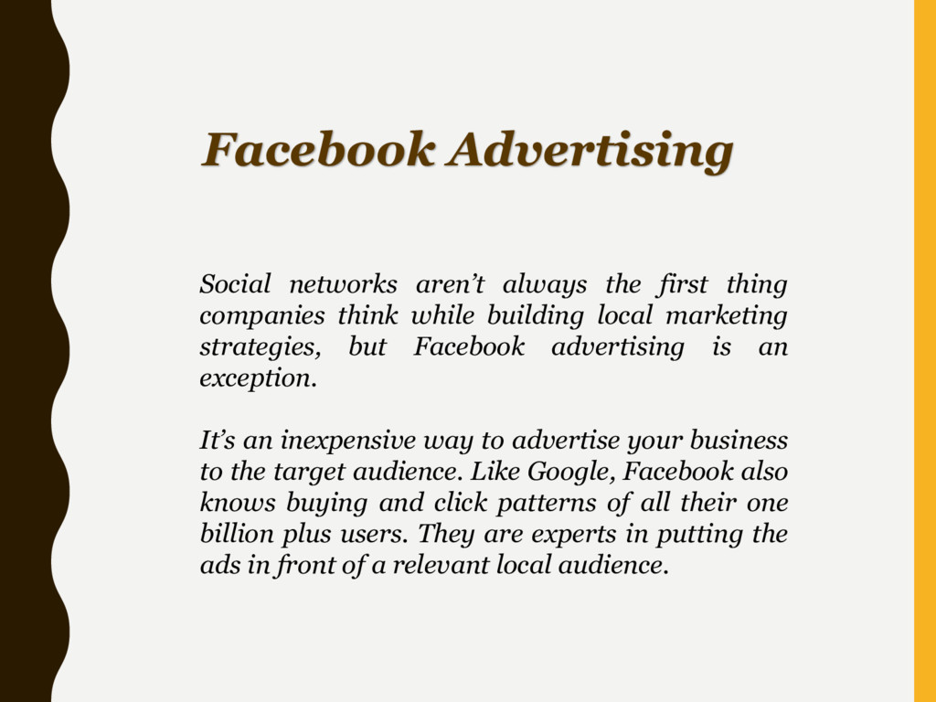think while building local marketing strategies, but Facebook advertising is an exception. It’s an inexpensive way to advertise your business to the target audience. Like Google, Facebook also knows buying and click patterns of all their one billion plus users. They are experts in putting the ads in front of a relevant local audience.