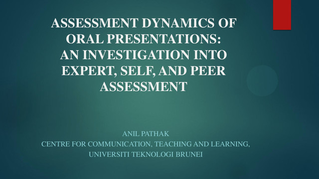 background studying Research Writing at a technological university. The research instrument consisted of a set of assessment checklists with weighted and specified criteria •Use of spoken media •Use of visuals, •Interrelationships •Communicative Effect. Broader criteria has been based on the following four factors: Participants received training and were involved in a practice session on self and peer assessment before engaging in the assessment tasks.