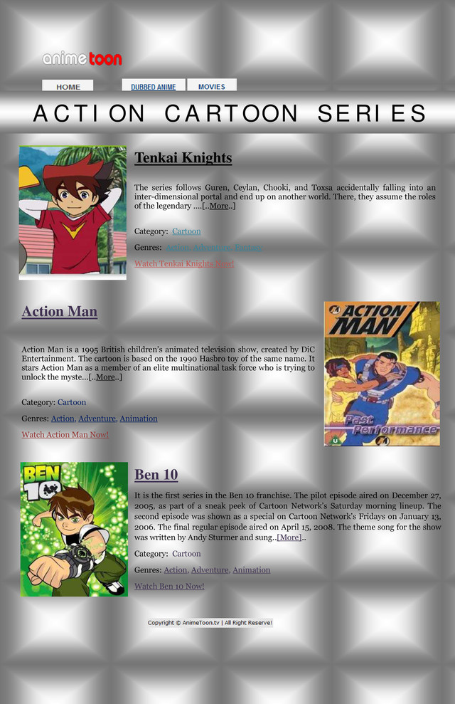 Chooki, and Toxsa accidentally falling into an inter-dimensional portal and end up on another world. There, they assume the roles of the legendary ….[..More..] Category: Cartoon Genres: Action, Adventure, Fantasy Watch Tenkai Knights Now! Action Man Action Man is a 1995 British children’s animated television show, created by DiC Entertainment. The cartoon is based on the 1990 Hasbro toy of the same name. It stars Action Man as a member of an elite multinational task force who is trying to unlock the myste...[..More..] Category: Cartoon Genres: Action, Adventure, Animation Watch Action Man Now! Ben 10 It is the first series in the Ben 10 franchise. The pilot episode aired on December 27, 2005, as part of a sneak peek of Cartoon Network’s Saturday morning lineup. The second episode was shown as a special on Cartoon Network’s Fridays on January 13, 2006. The final regular episode aired on April 15, 2008. The theme song for the show was written by Andy Sturmer and sung..[More].. Category: Cartoon Genres: Action, Adventure, Animation Watch Ben 10 Now!
