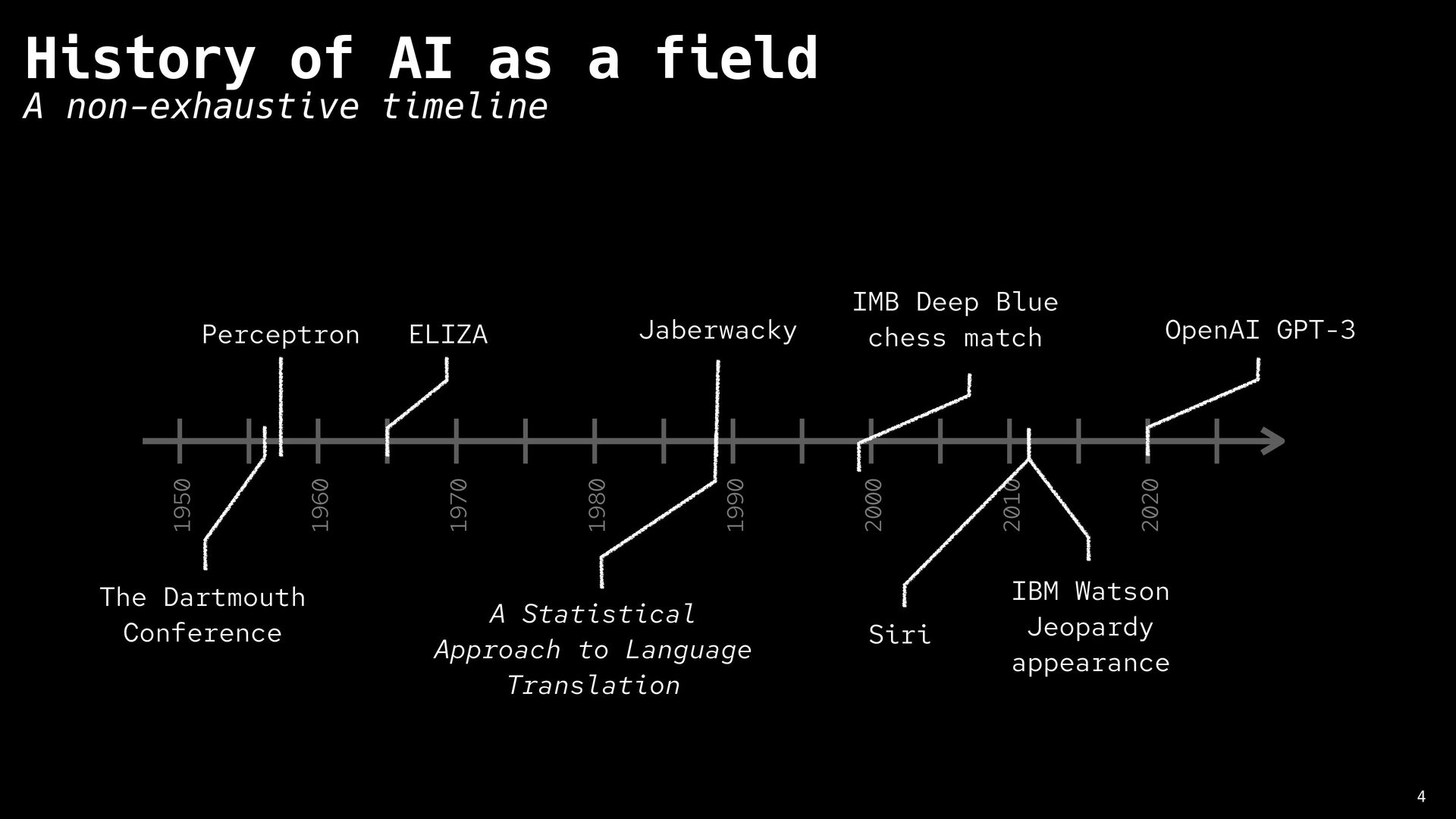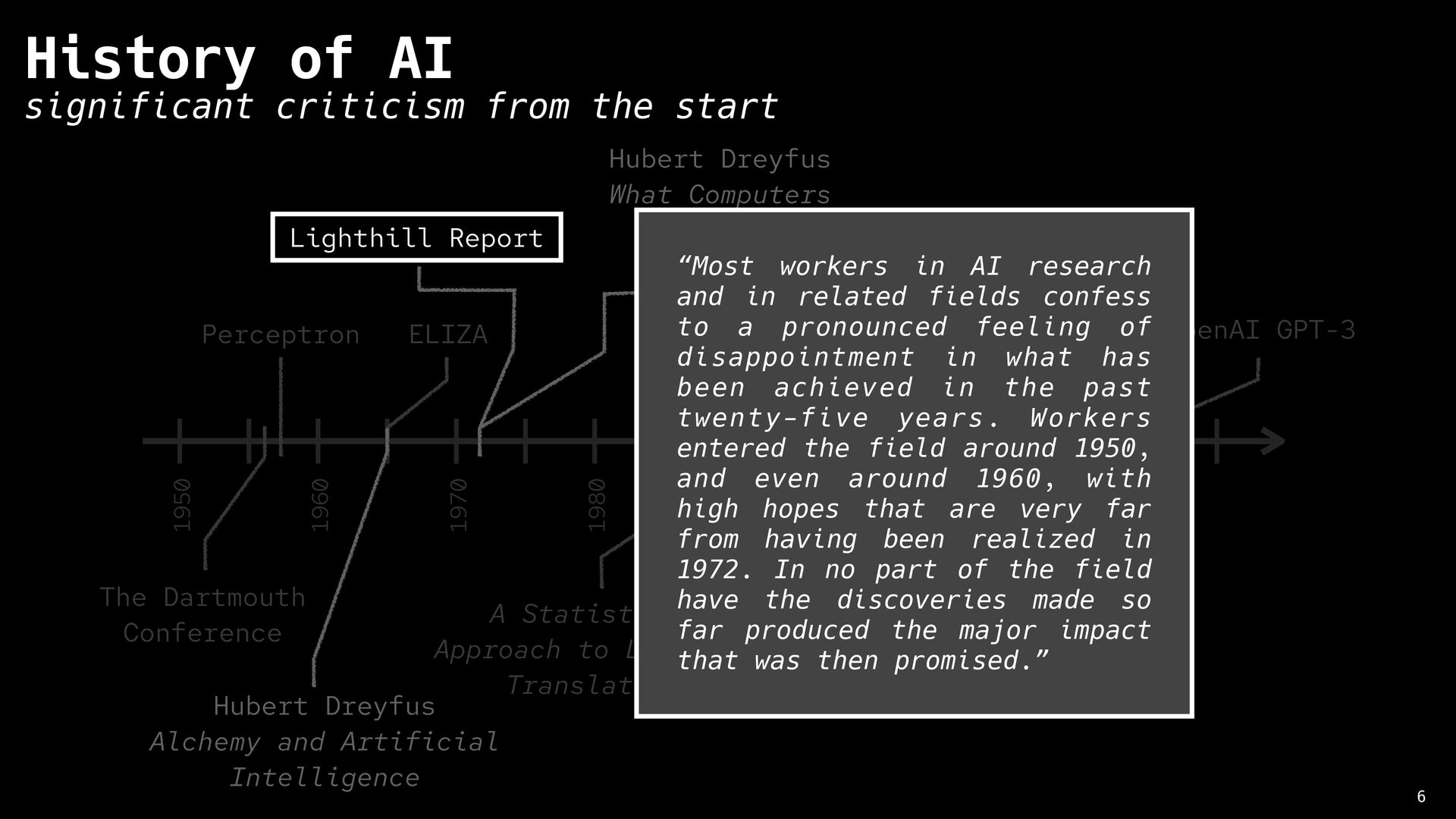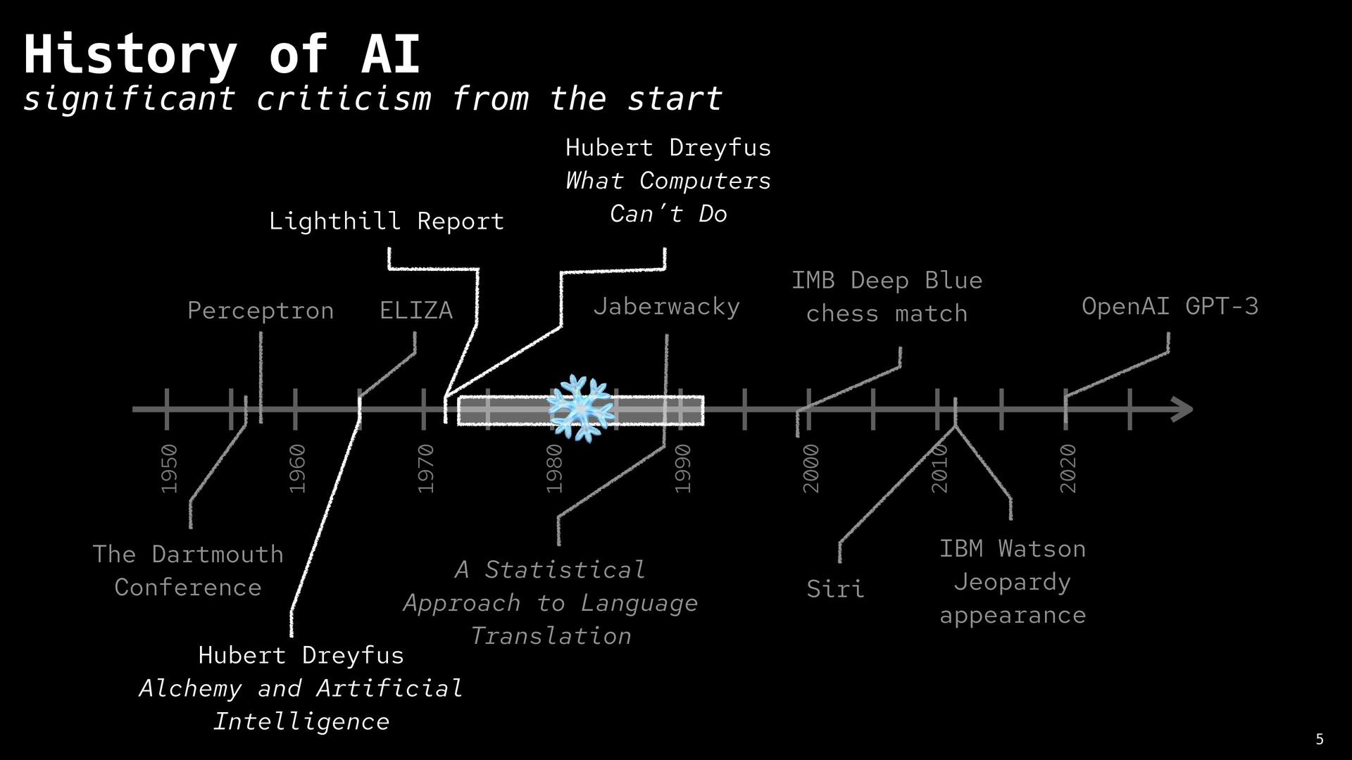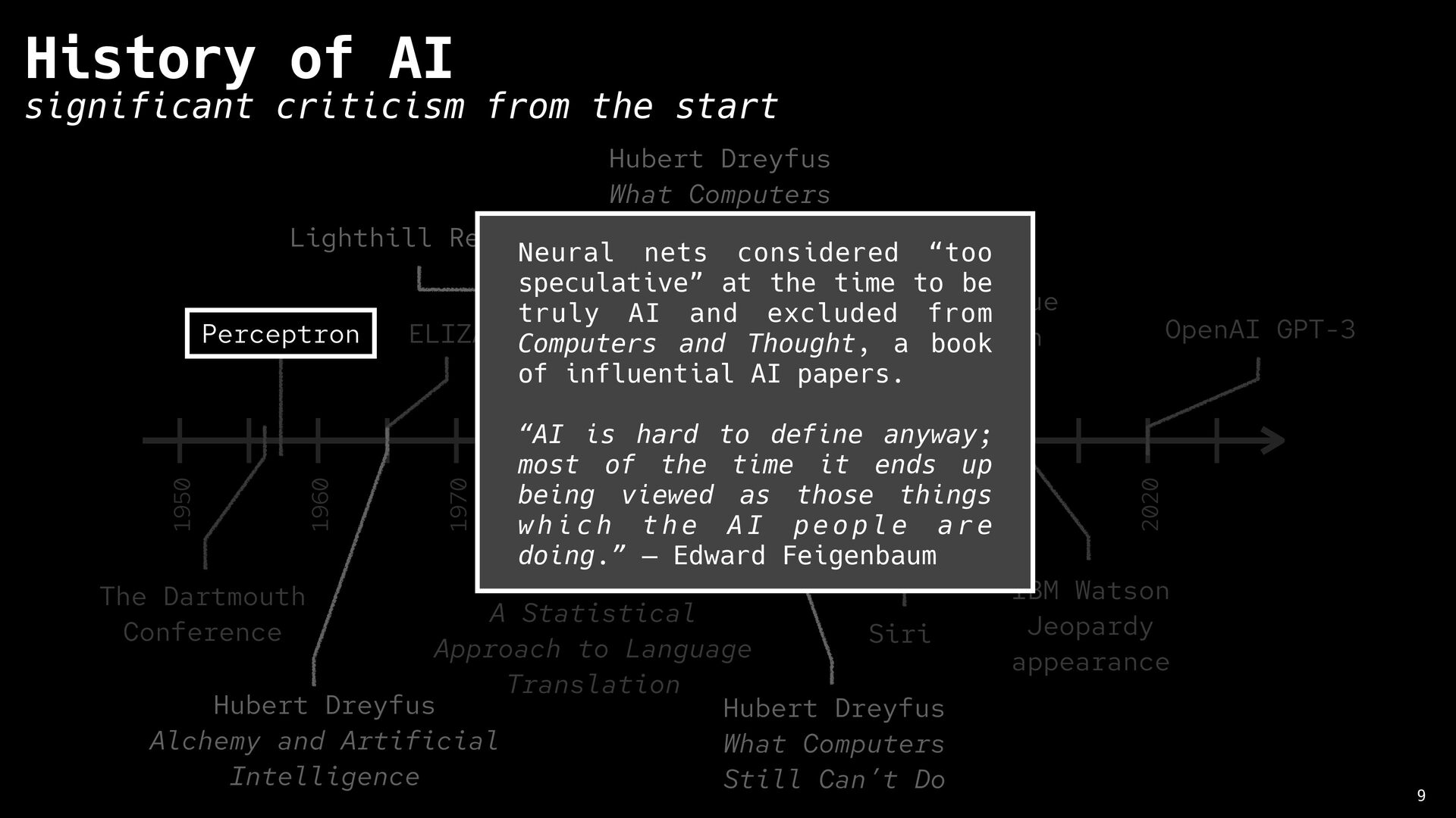 Artificial Intelligence 8 History of AI significant criticism from the start 1950 1960 1970 1980 1990 2000 2010 2020 The Dartmouth Conference Perceptron ELIZA Jaberwacky A Statistical Approach to Language Translation IMB Deep Blue chess match IBM Watson Jeopardy appearance Siri OpenAI GPT-3 Lighthill Report Hubert Dreyfus What Computers Still Can’t Do “No piece of equipment makes sense by itself … What makes an object a chair is its function, and what makes possible its role as equipment for sitting is its place in a total practical context. This presupposes certain facts about human beings (fatigue, the ways the body bends), and a network of other culturally determined equipment (tables, floors, lamps), and skills (eating, writing, going to conferences, giving lectures, etc.)”