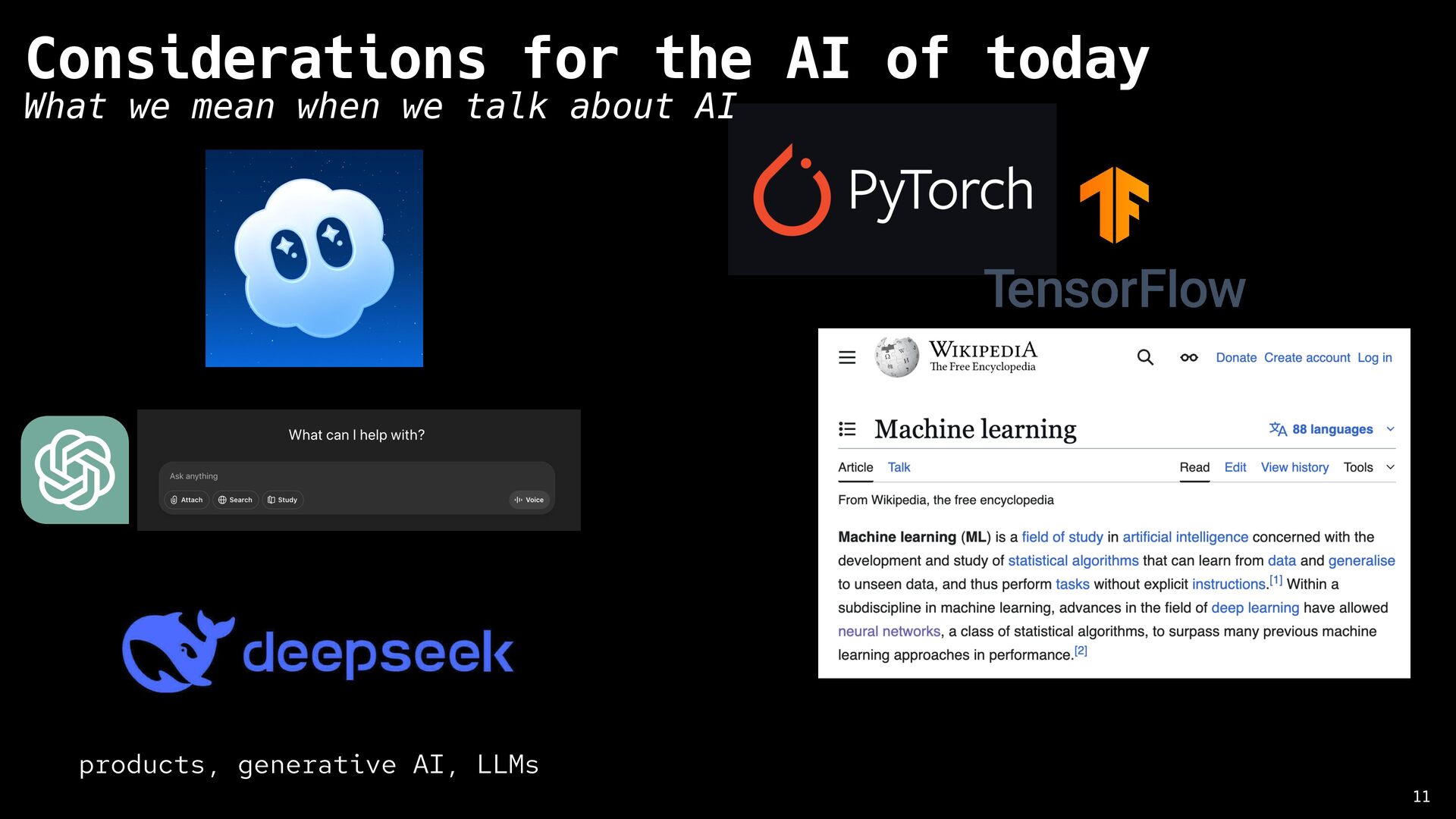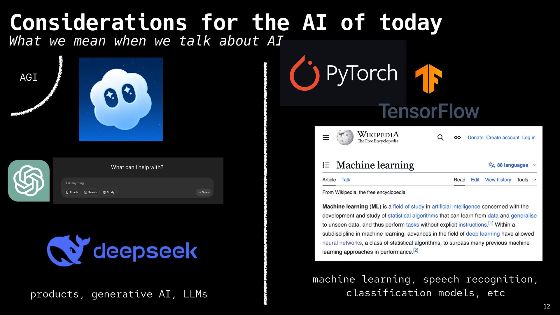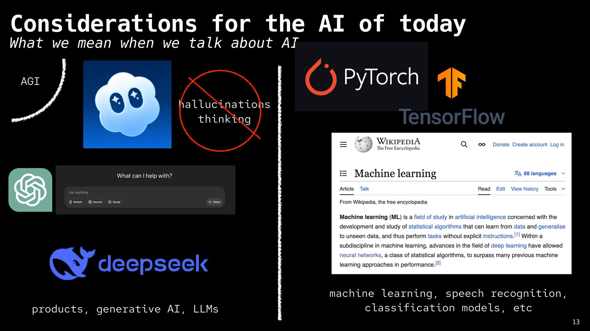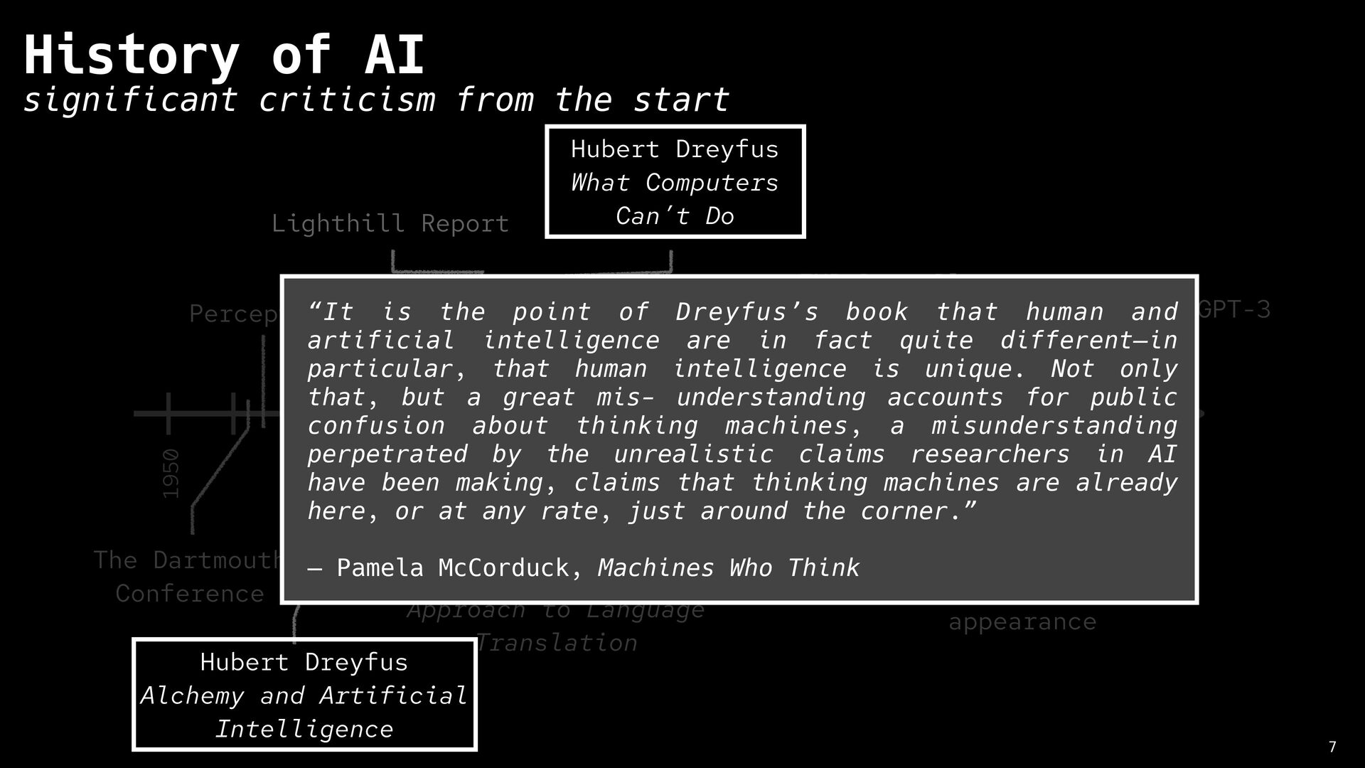Artificial Intelligence 8 History of AI significant criticism from the start 1950 1960 1970 1980 1990 2000 2010 2020 The Dartmouth Conference Perceptron ELIZA Jaberwacky A Statistical Approach to Language Translation IMB Deep Blue chess match IBM Watson Jeopardy appearance Siri OpenAI GPT-3 Lighthill Report Hubert Dreyfus What Computers Still Can’t Do “No piece of equipment makes sense by itself … What makes an object a chair is its function, and what makes possible its role as equipment for sitting is its place in a total practical context. This presupposes certain facts about human beings (fatigue, the ways the body bends), and a network of other culturally determined equipment (tables, floors, lamps), and skills (eating, writing, going to conferences, giving lectures, etc.)”