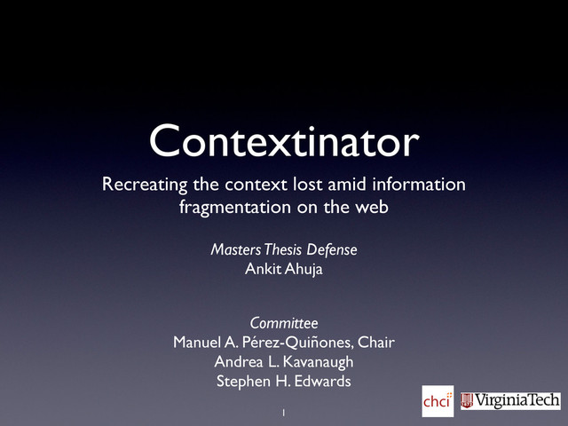 http://contextinator.cs.vt.edu/ 2,315 Users on the Chrome Web Store “Contextinator Organizes Your Web Browsing Into Manageable Projects” - Lifehacker “Contextinator: Manage Your Browsing Tasks Into Separate Easily Accessible Projects” - MakeUseOf “A sync via google drive would be very neat. So that Desktop machine and notebook/tablet and so on could use the same projects.” - Chrome Web Store “Using this to plan my vacation and I'm impressed. So far brilliantly laid out. Kind of hard to get the hang of at first. I wish things were draggable and droppable; Wish tasks could be edited after creating.” - Chrome Web Store “...helps take some of the stress off by allowing me to organize them all (tabs) and view it in a single window...” - Chrome Web Store “I'm quickly falling in love with #Contextinator! I've been looking for something like this for years!” - @Dahie “Really loving Contextinator - use it for when I research topics!” - @pixelbud “Contextinator - Projects within Chrome, with tabs, bookmarks, tasks, emails. WHERE HAVE YOU BEEN MY WHOLE LIFE?” - @mgamini