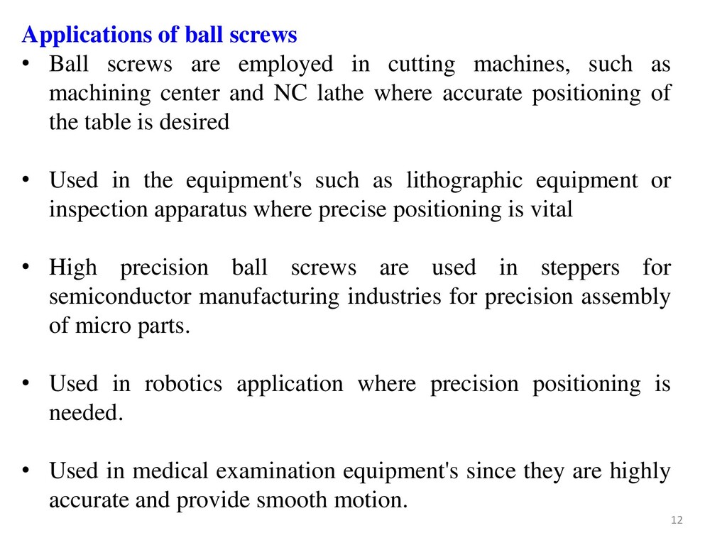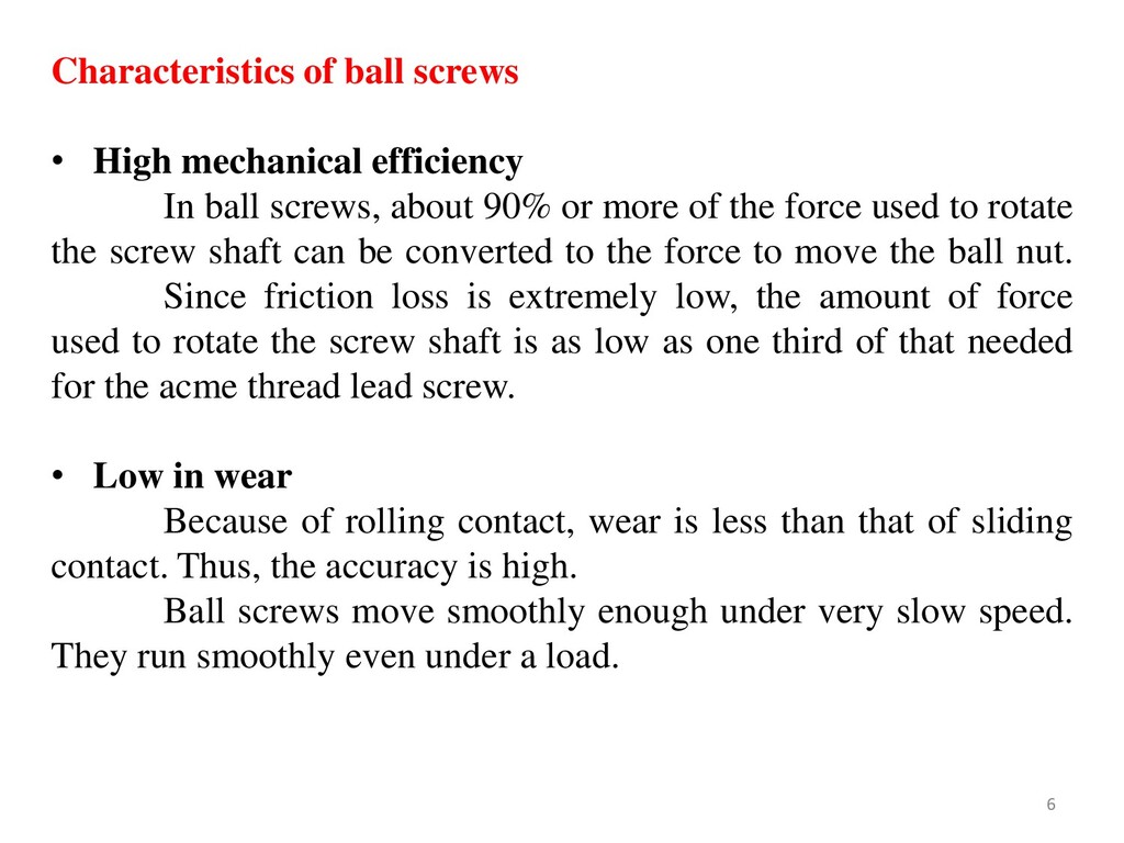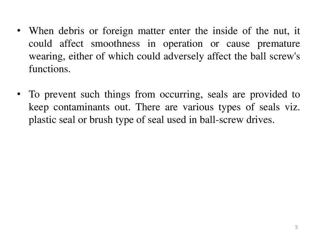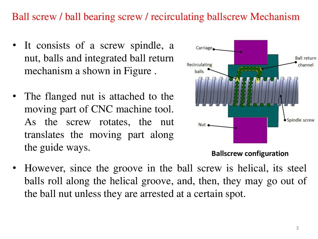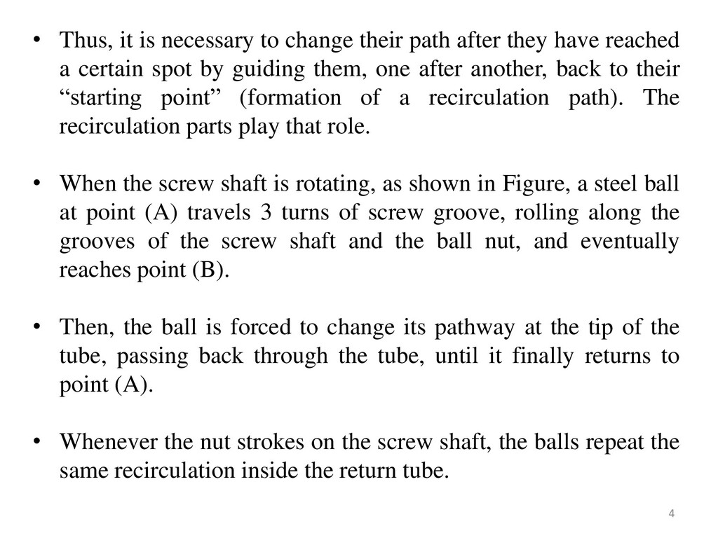 they have reached a certain spot by guiding them, one after another, back to their “starting point” (formation of a recirculation path). The recirculation parts play that role. • When the screw shaft is rotating, as shown in Figure, a steel ball at point (A) travels 3 turns of screw groove, rolling along the grooves of the screw shaft and the ball nut, and eventually reaches point (B). • Then, the ball is forced to change its pathway at the tip of the tube, passing back through the tube, until it finally returns to point (A). • Whenever the nut strokes on the screw shaft, the balls repeat the same recirculation inside the return tube. 4