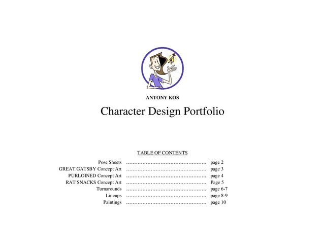 …………………………………………. page 2 GREAT GATSBY Concept Art …………………………………………. page 3 PURLOINED Concept Art …………………………………………. page 4 RAT SNACKS Concept Art …………………………………………. Page 5 Turnarounds …………………………………………. page 6-7 Lineups …………………………………………. page 8-9 Paintings …………………………………………. page 10