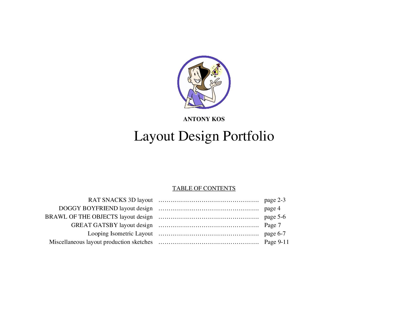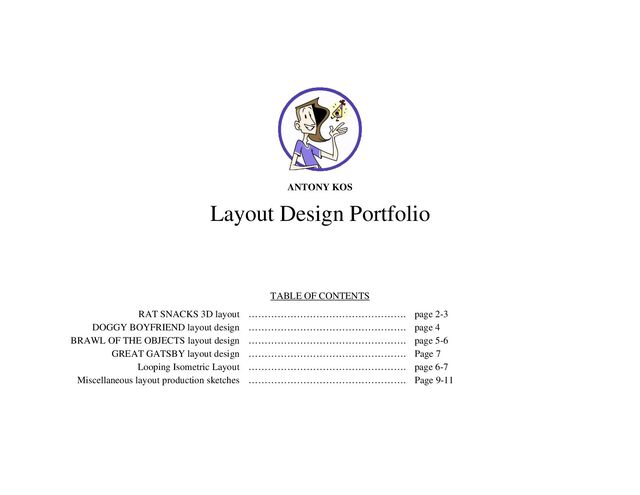 3D layout …………………………………………. page 2-3 DOGGY BOYFRIEND layout design …………………………………………. page 4 BRAWL OF THE OBJECTS layout design …………………………………………. page 5-6 GREAT GATSBY layout design …………………………………………. Page 7 Looping Isometric Layout …………………………………………. page 6-7 Miscellaneous layout production sketches …………………………………………. Page 9-11