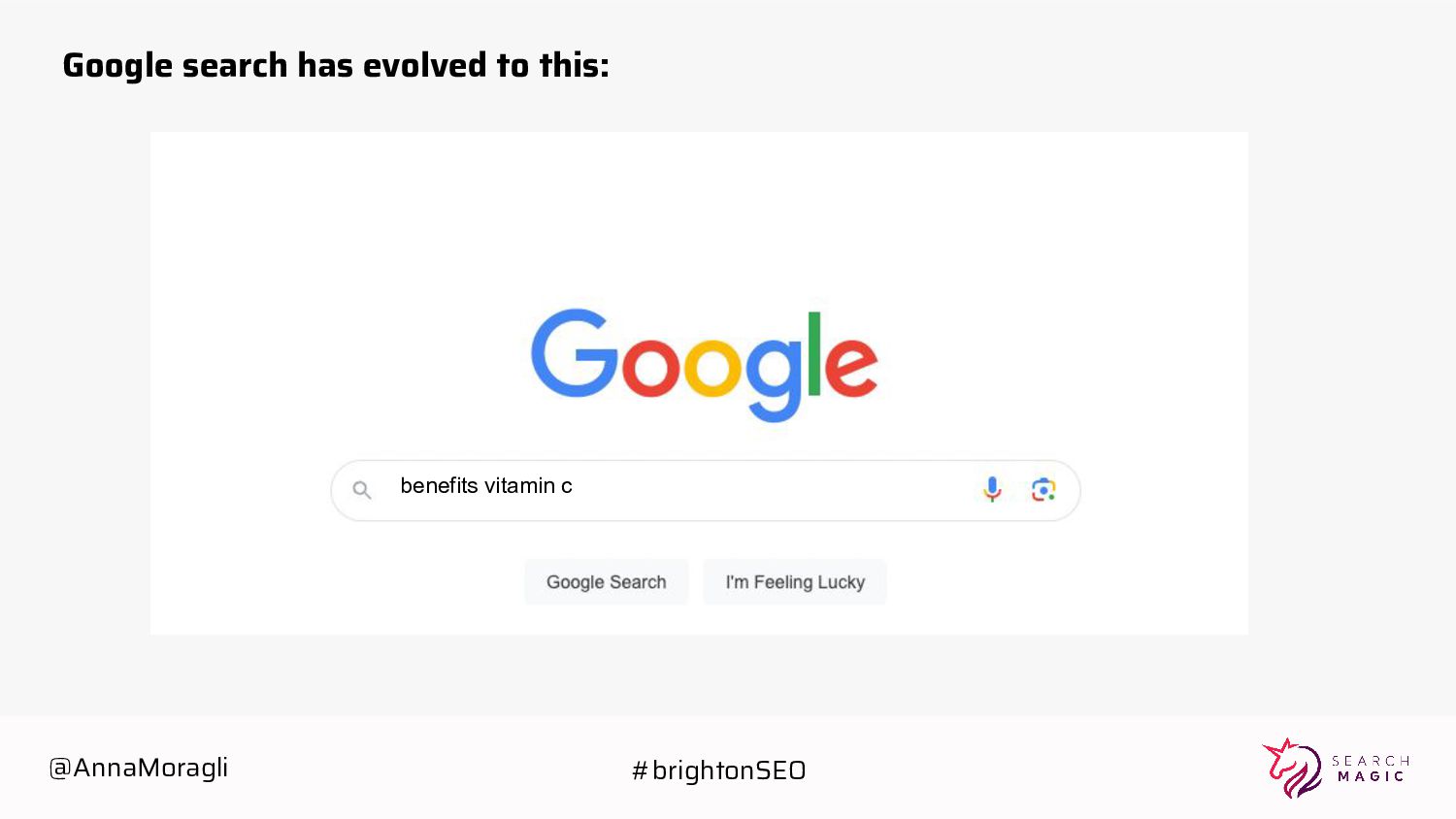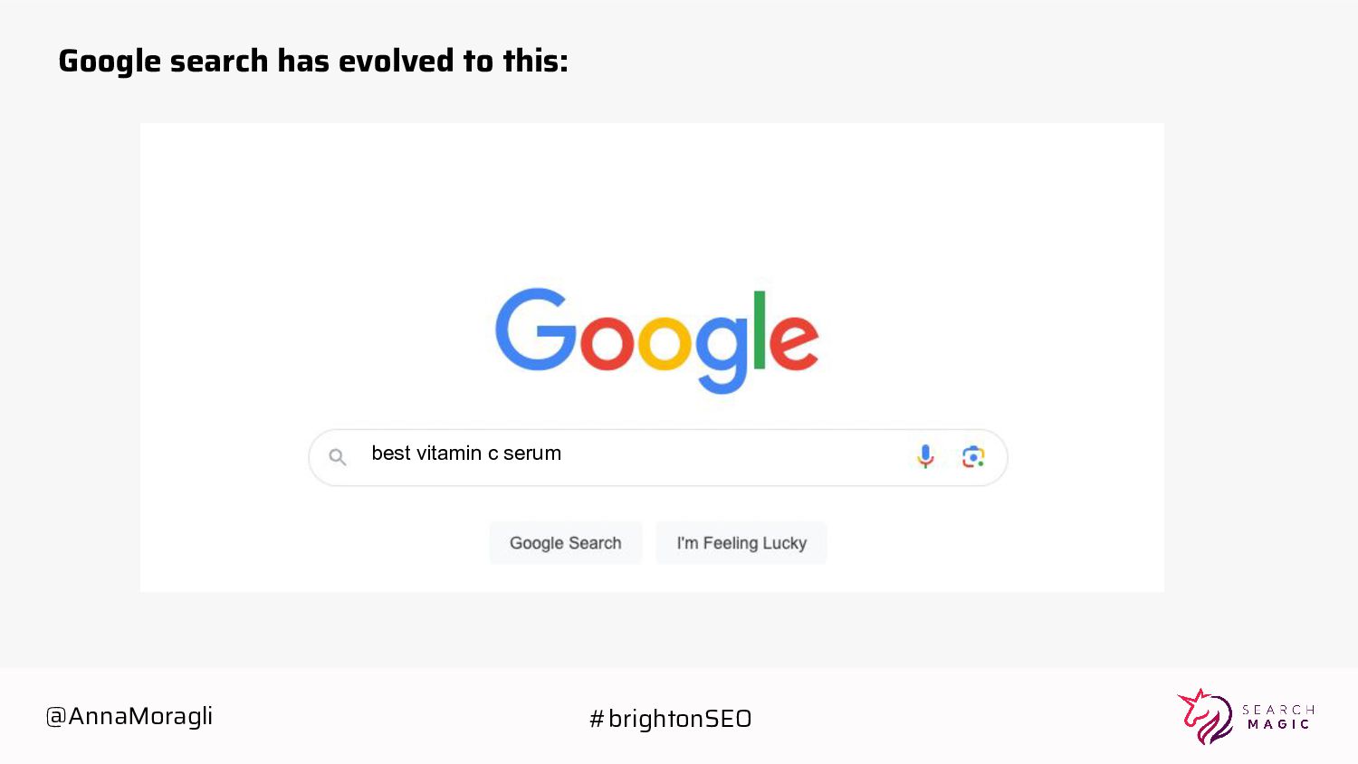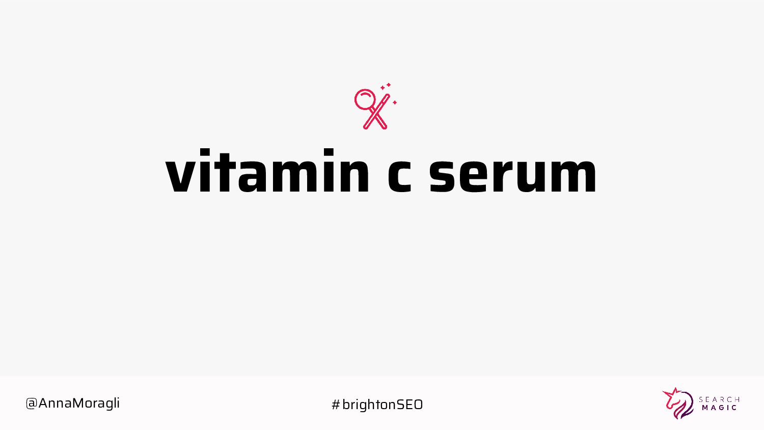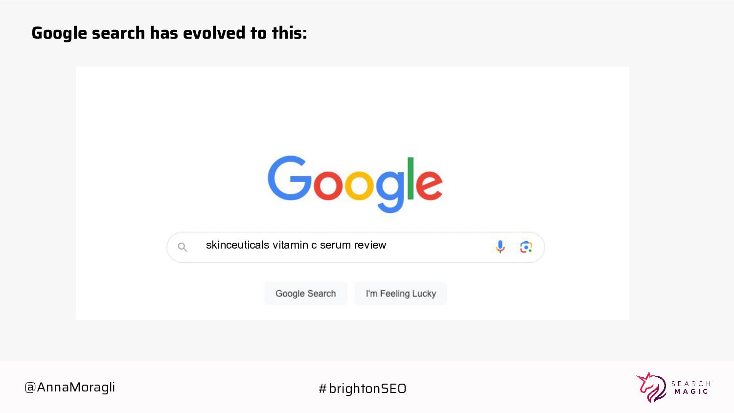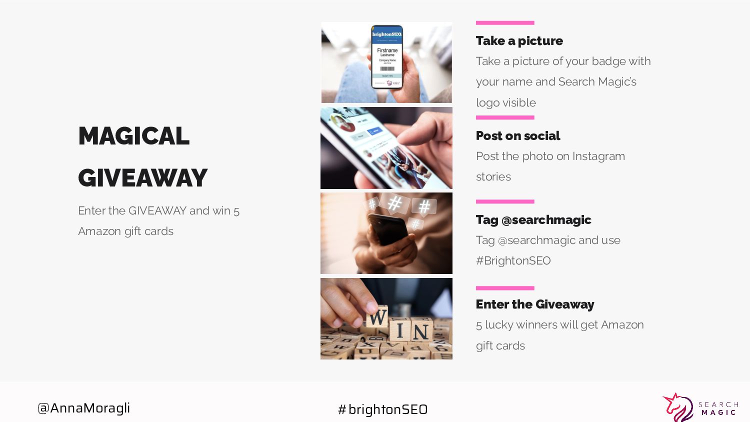 cards Take a picture Post on social Tag @searchmagic Enter the Giveaway Take a picture of your badge with your name and Search Magic’s logo visible Tag @searchmagic and use #BrightonSEO Post the photo on Instagram stories 5 lucky winners will get Amazon gift cards @AnnaMoragli #brightonSEO