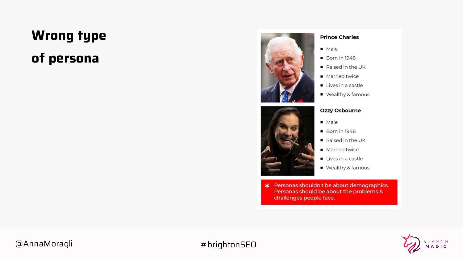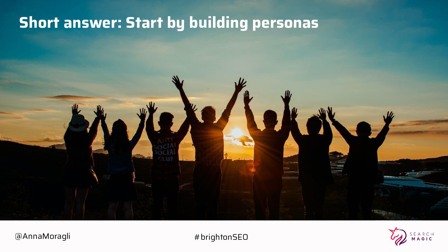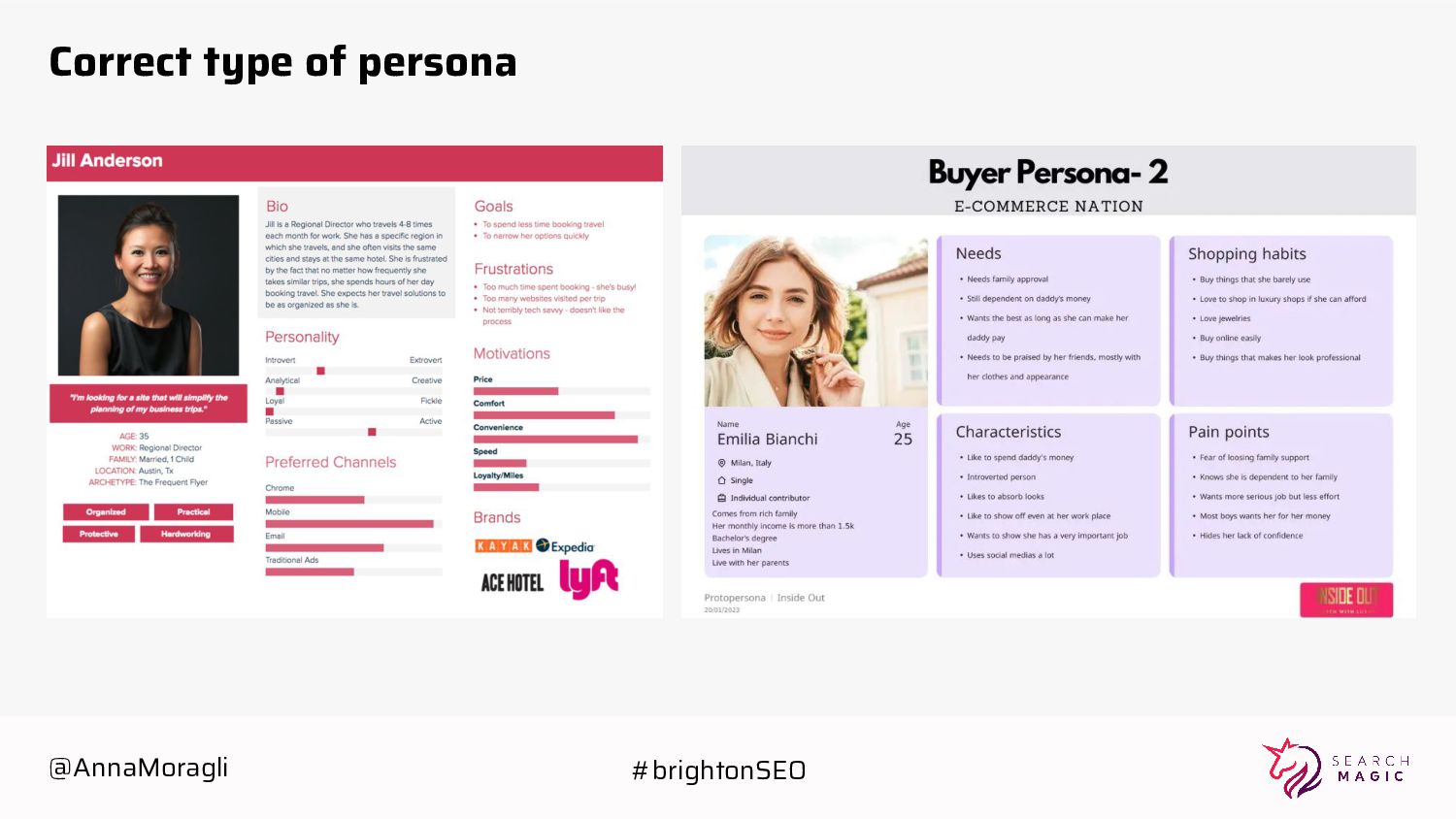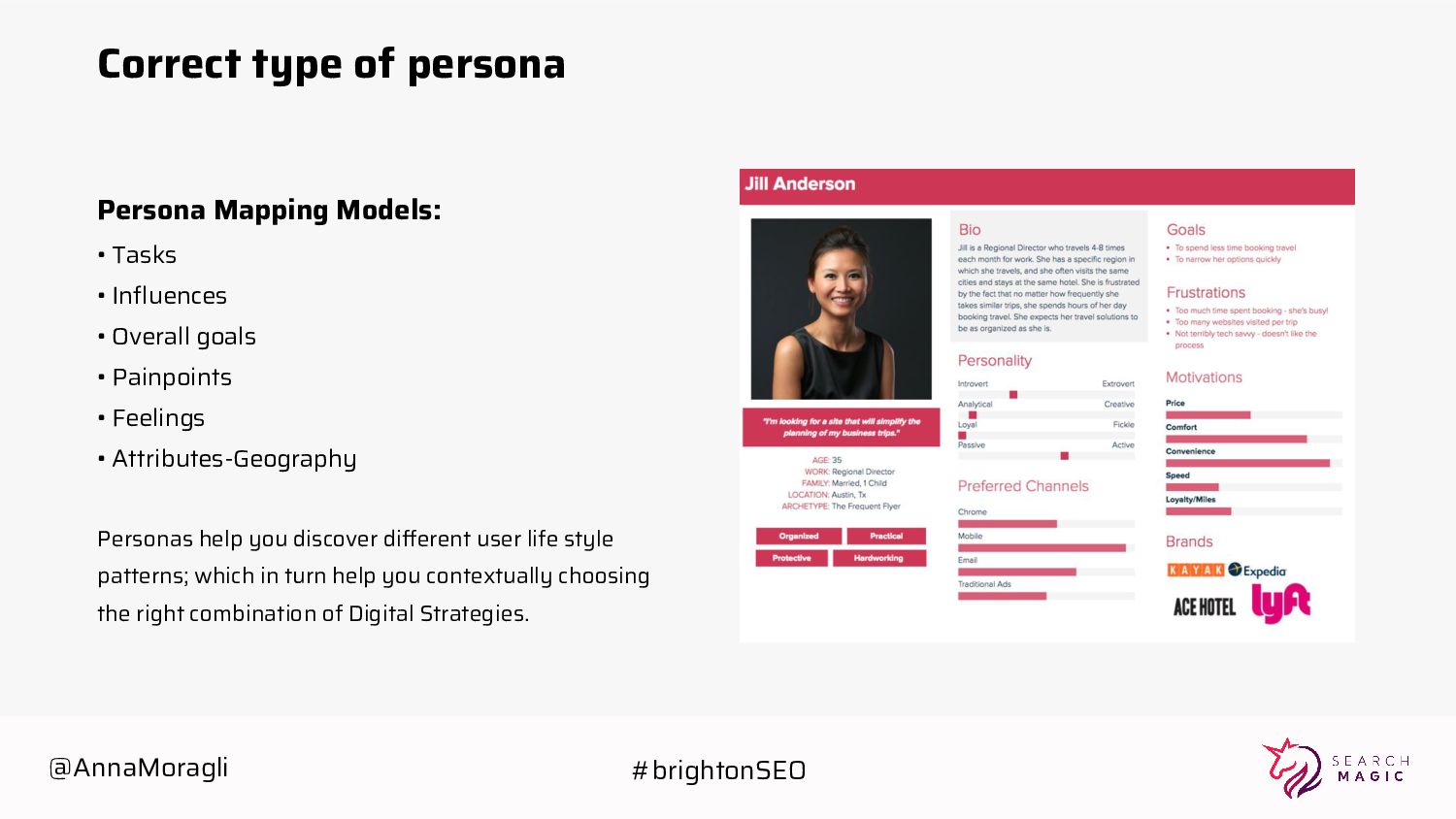 Tasks • Influences • Overall goals • Painpoints • Feelings • Attributes-Geography Personas help you discover different user life style patterns; which in turn help you contextually choosing the right combination of Digital Strategies. @AnnaMoragli #brightonSEO