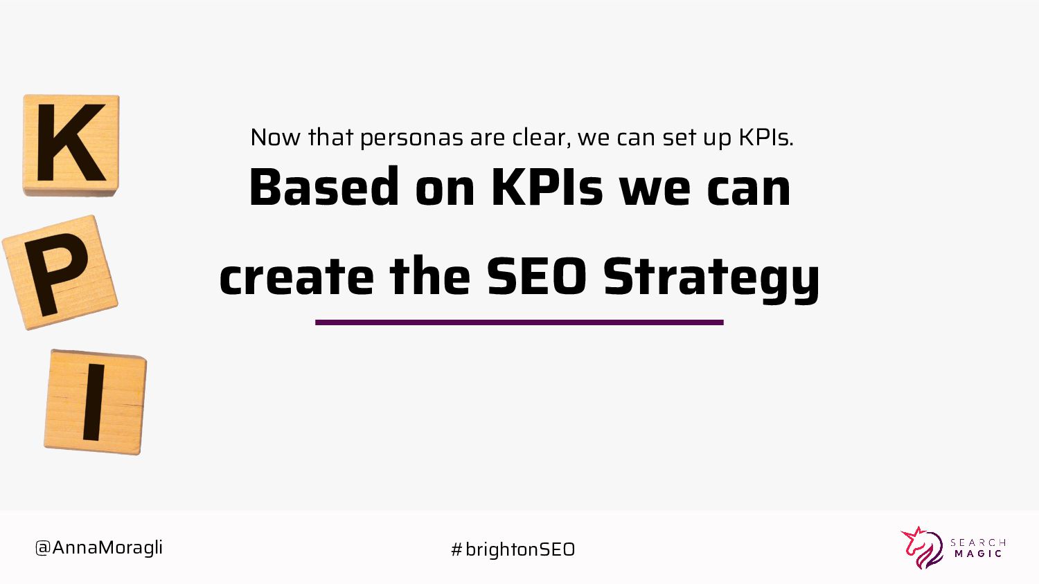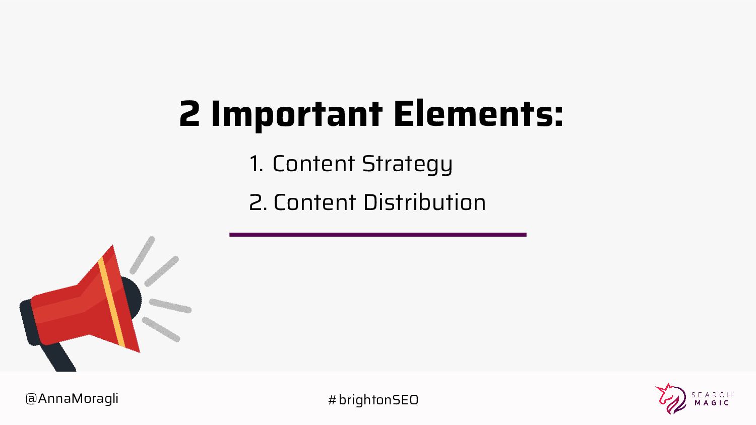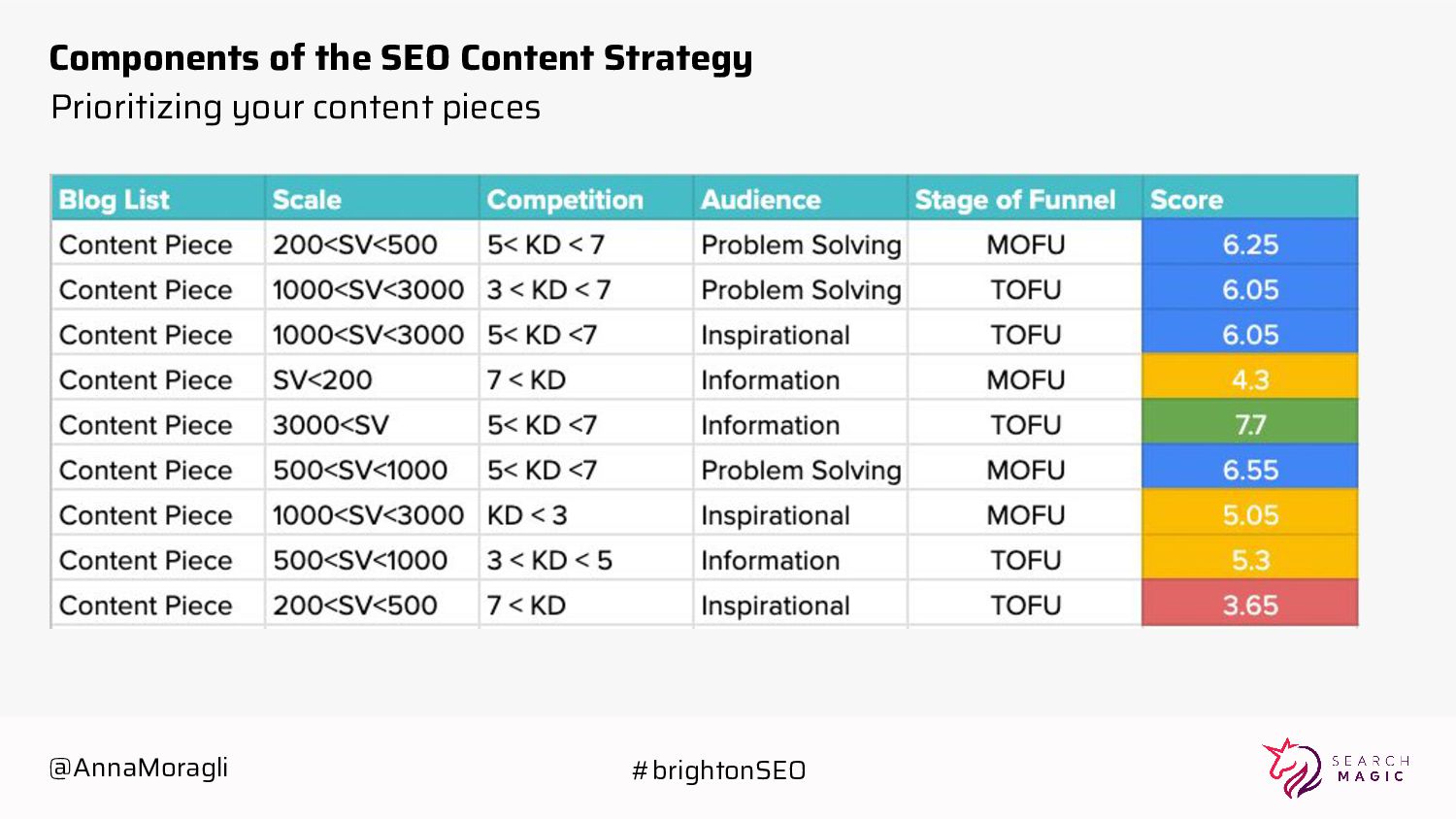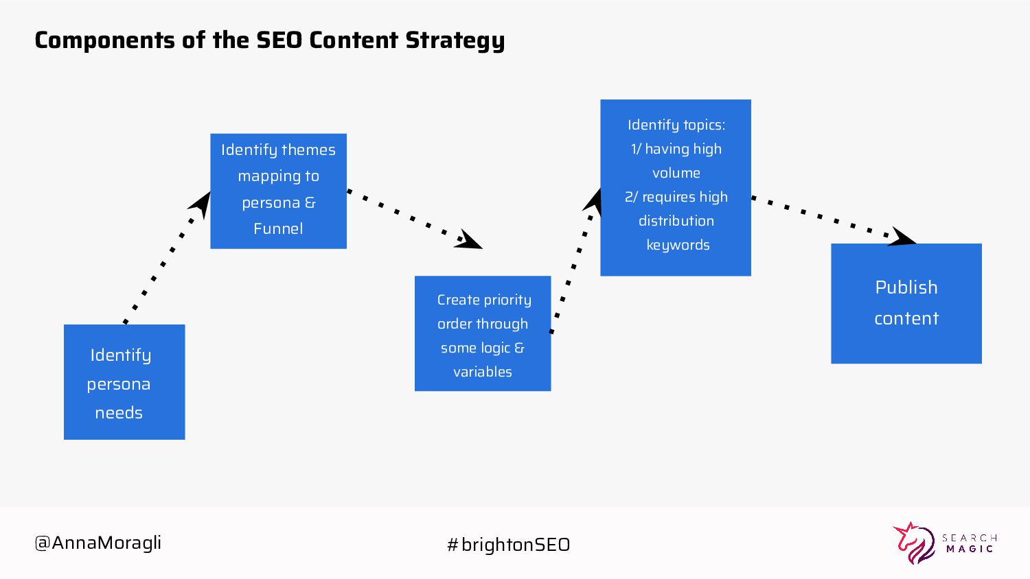 Create priority order through some logic & variables Identify topics: 1/ having high volume 2/ requires high distribution keywords Publish content Components of the SEO Content Strategy @AnnaMoragli #brightonSEO