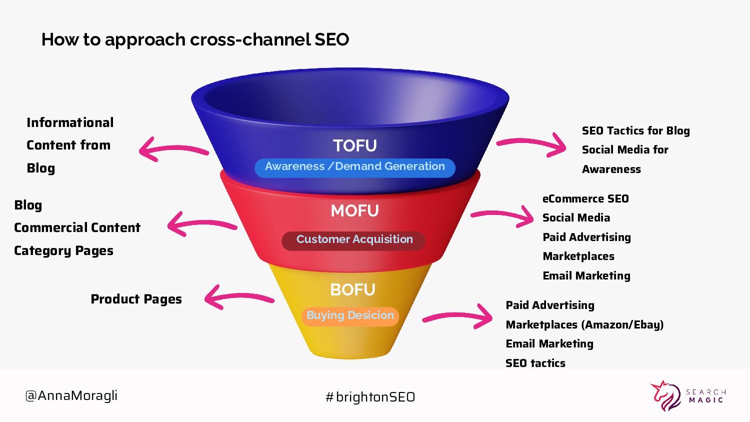 MOFU BOFU Awareness /Demand Generation Customer Acquisition Paid Advertising Marketplaces (Amazon/Ebay) Email Marketing SEO tactics Informational Content from Blog Blog Commercial Content Category Pages Product Pages SEO Tactics for Blog Social Media for Awareness eCommerce SEO Social Media Paid Advertising Marketplaces Email Marketing @AnnaMoragli #brightonSEO