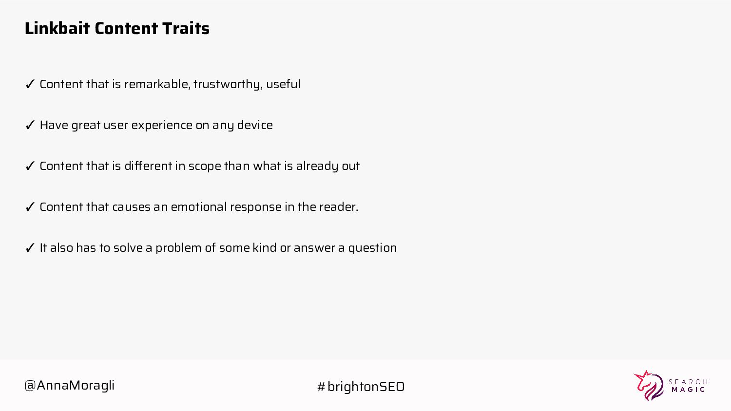 ✓ Have great user experience on any device ✓ Content that is different in scope than what is already out ✓ Content that causes an emotional response in the reader. ✓ It also has to solve a problem of some kind or answer a question @AnnaMoragli #brightonSEO