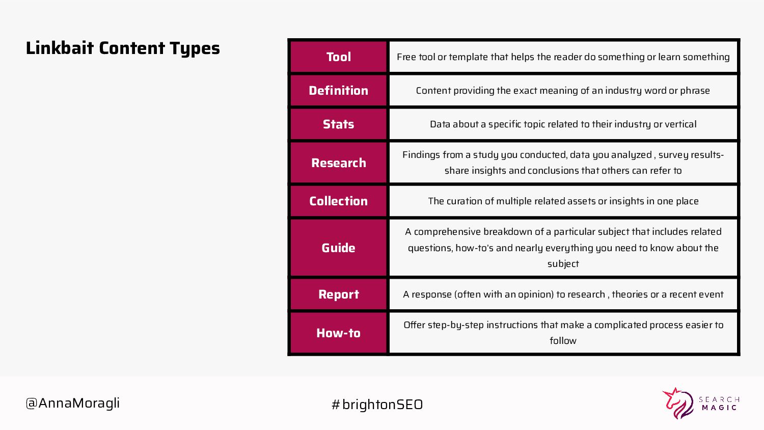 the reader do something or learn something Definition Content providing the exact meaning of an industry word or phrase Stats Data about a specific topic related to their industry or vertical Research Findings from a study you conducted, data you analyzed , survey results- share insights and conclusions that others can refer to Collection The curation of multiple related assets or insights in one place Guide A comprehensive breakdown of a particular subject that includes related questions, how-to’s and nearly everything you need to know about the subject Report A response (often with an opinion) to research , theories or a recent event How-to Offer step-by-step instructions that make a complicated process easier to follow @AnnaMoragli #brightonSEO