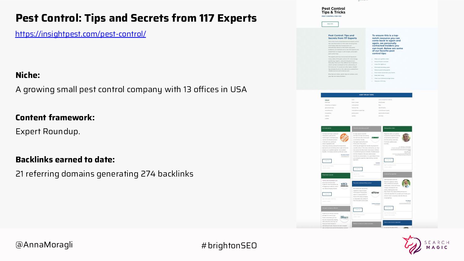 growing small pest control company with 13 offices in USA Content framework: Expert Roundup. Backlinks earned to date: 21 referring domains generating 274 backlinks https://insightpest.com/pest-control/ @AnnaMoragli #brightonSEO