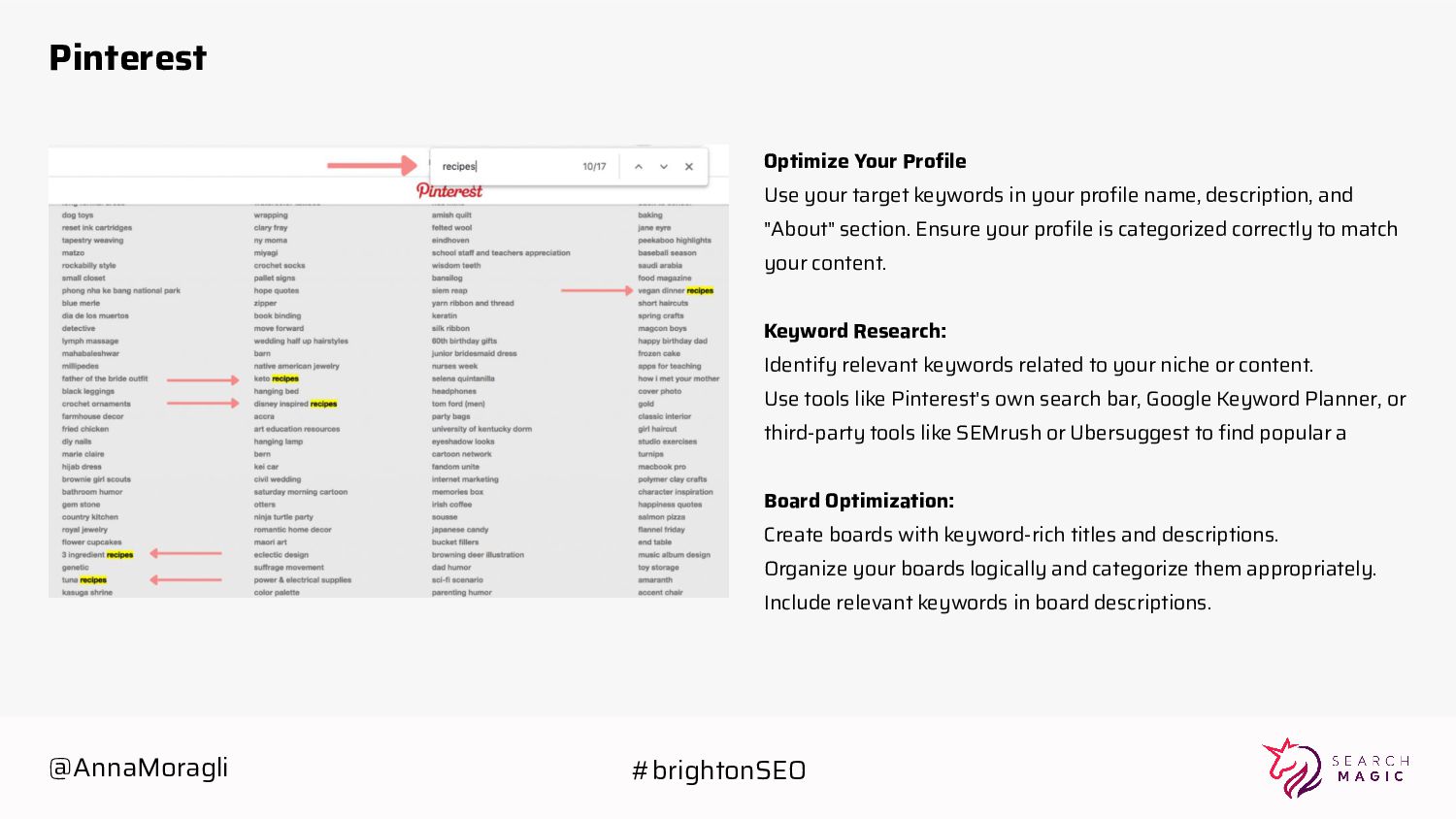 profile name, description, and "About" section. Ensure your profile is categorized correctly to match your content. Keyword Research: Identify relevant keywords related to your niche or content. Use tools like Pinterest's own search bar, Google Keyword Planner, or third-party tools like SEMrush or Ubersuggest to find popular a Board Optimization: Create boards with keyword-rich titles and descriptions. Organize your boards logically and categorize them appropriately. Include relevant keywords in board descriptions. @AnnaMoragli #brightonSEO