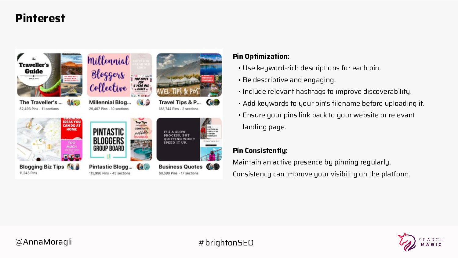 • Be descriptive and engaging. • Include relevant hashtags to improve discoverability. • Add keywords to your pin's filename before uploading it. • Ensure your pins link back to your website or relevant landing page. Pin Consistently: Maintain an active presence by pinning regularly. Consistency can improve your visibility on the platform. @AnnaMoragli #brightonSEO