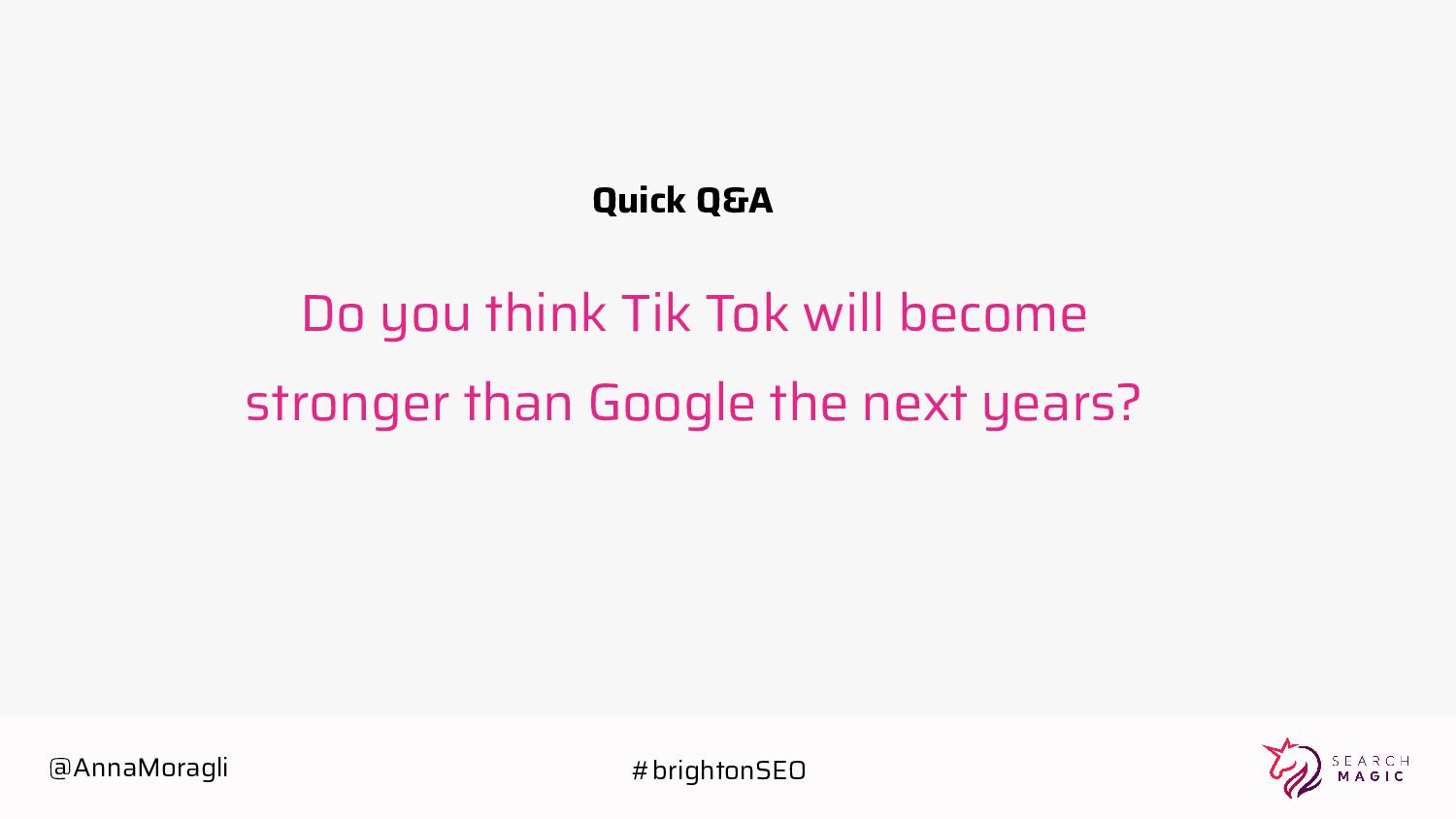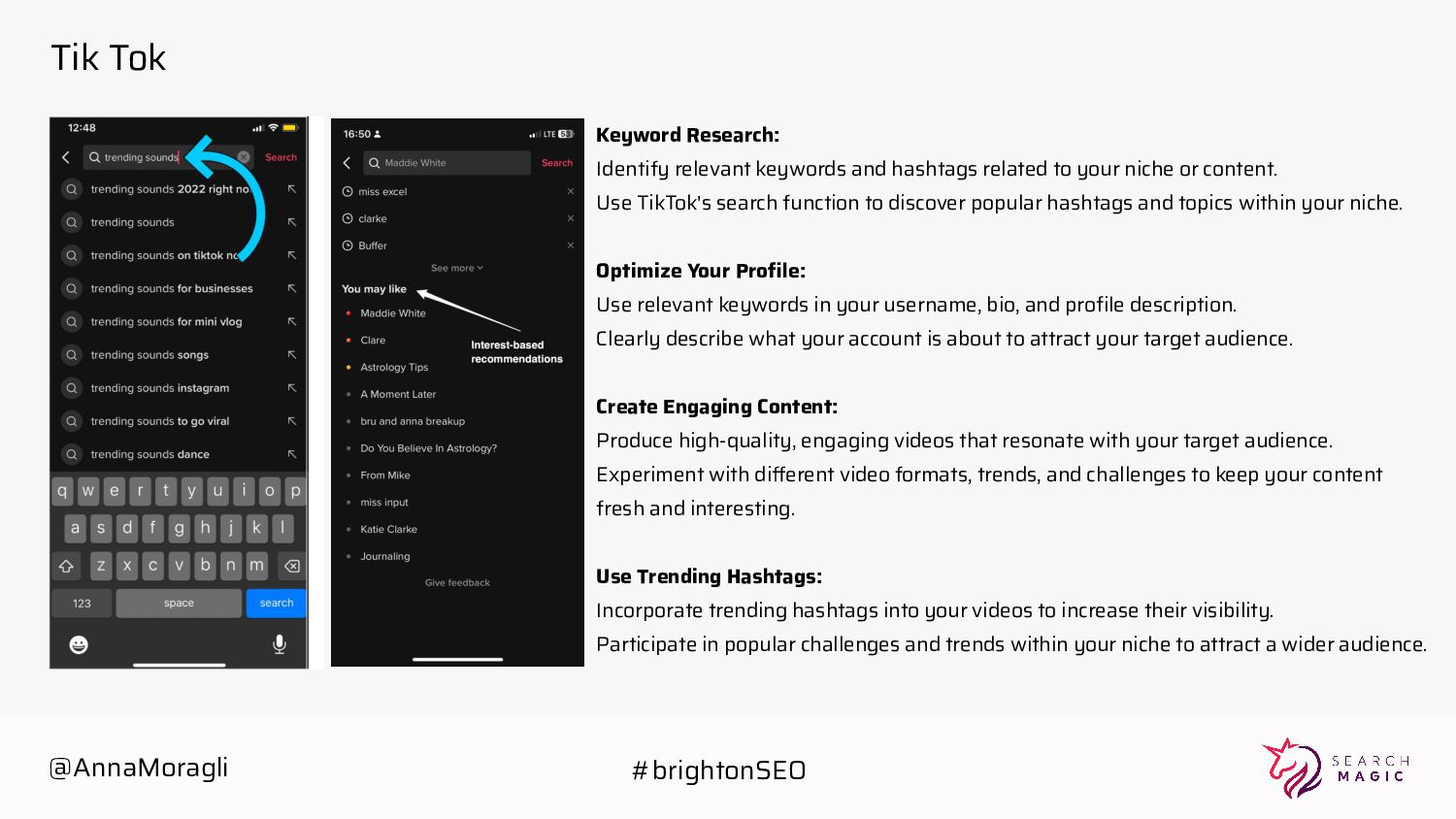to your niche or content. Use TikTok's search function to discover popular hashtags and topics within your niche. Optimize Your Profile: Use relevant keywords in your username, bio, and profile description. Clearly describe what your account is about to attract your target audience. Create Engaging Content: Produce high-quality, engaging videos that resonate with your target audience. Experiment with different video formats, trends, and challenges to keep your content fresh and interesting. Use Trending Hashtags: Incorporate trending hashtags into your videos to increase their visibility. Participate in popular challenges and trends within your niche to attract a wider audience. @AnnaMoragli #brightonSEO