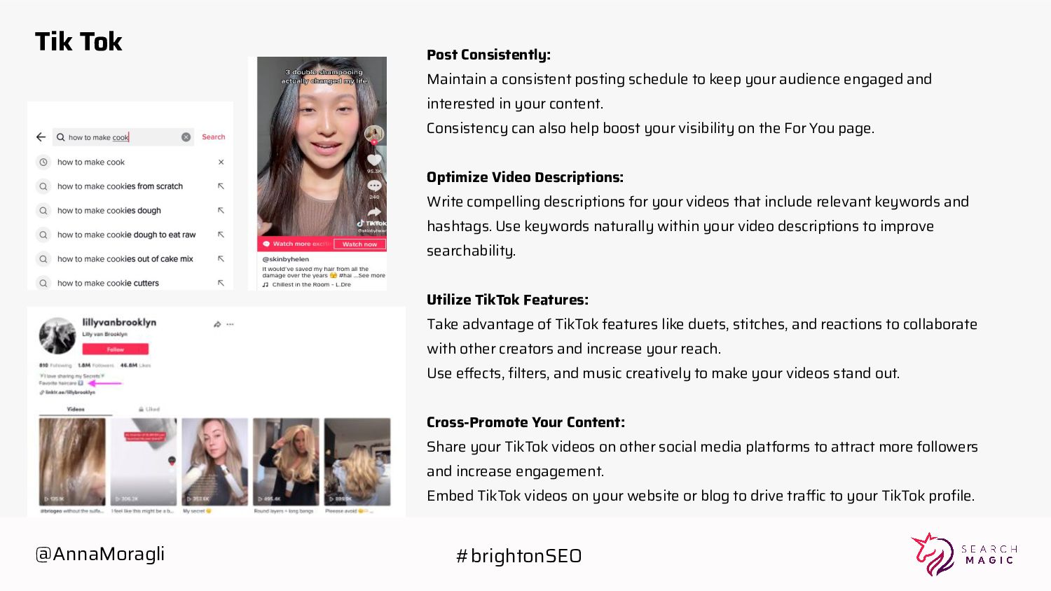 audience engaged and interested in your content. Consistency can also help boost your visibility on the For You page. Optimize Video Descriptions: Write compelling descriptions for your videos that include relevant keywords and hashtags. Use keywords naturally within your video descriptions to improve searchability. Utilize TikTok Features: Take advantage of TikTok features like duets, stitches, and reactions to collaborate with other creators and increase your reach. Use effects, filters, and music creatively to make your videos stand out. Cross-Promote Your Content: Share your TikTok videos on other social media platforms to attract more followers and increase engagement. Embed TikTok videos on your website or blog to drive traffic to your TikTok profile. Tik Tok @AnnaMoragli #brightonSEO