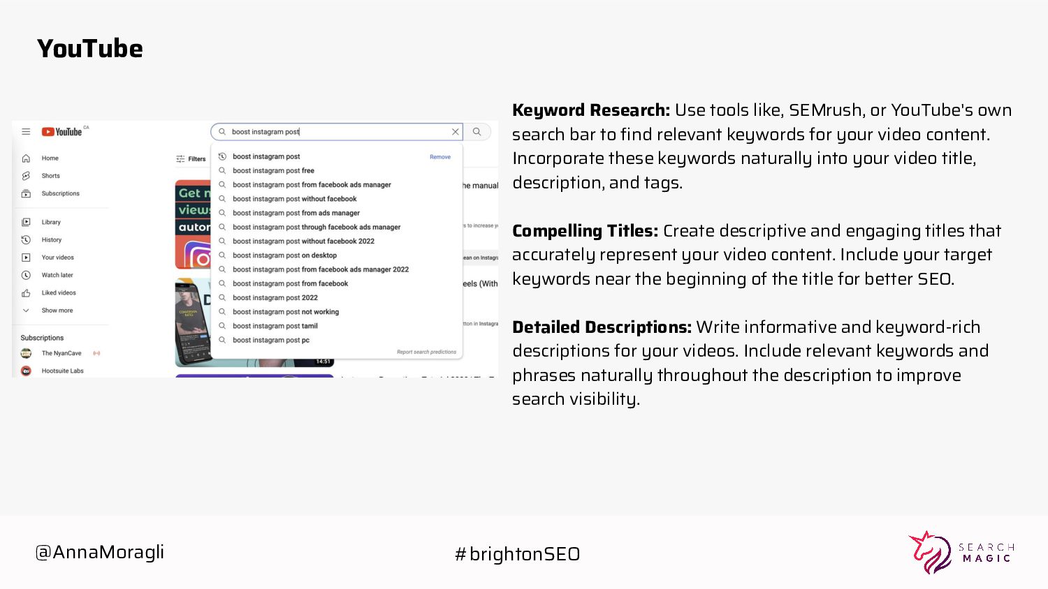 search bar to find relevant keywords for your video content. Incorporate these keywords naturally into your video title, description, and tags. Compelling Titles: Create descriptive and engaging titles that accurately represent your video content. Include your target keywords near the beginning of the title for better SEO. Detailed Descriptions: Write informative and keyword-rich descriptions for your videos. Include relevant keywords and phrases naturally throughout the description to improve search visibility. @AnnaMoragli #brightonSEO