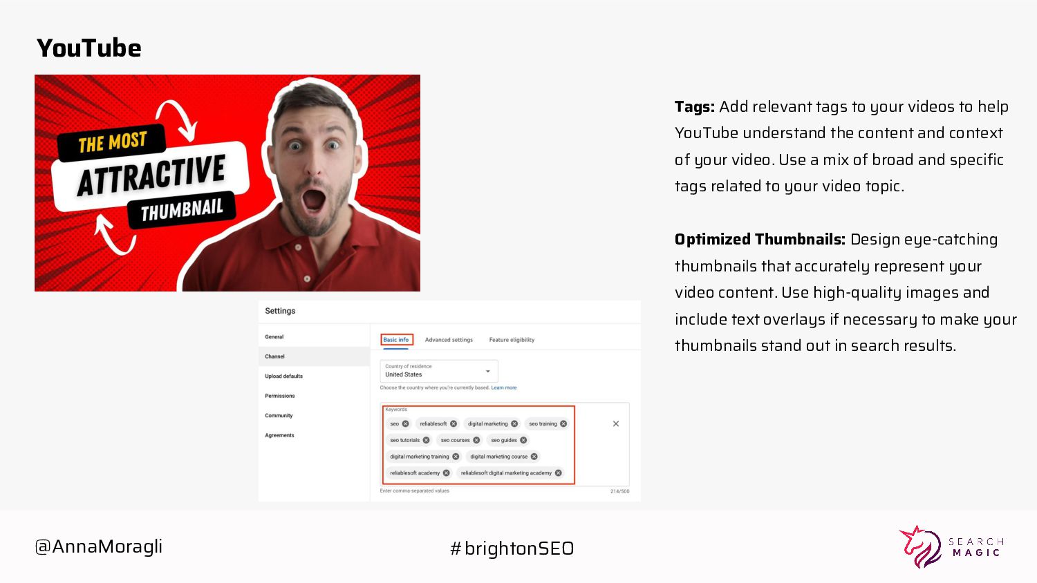 YouTube understand the content and context of your video. Use a mix of broad and specific tags related to your video topic. Optimized Thumbnails: Design eye-catching thumbnails that accurately represent your video content. Use high-quality images and include text overlays if necessary to make your thumbnails stand out in search results. @AnnaMoragli #brightonSEO