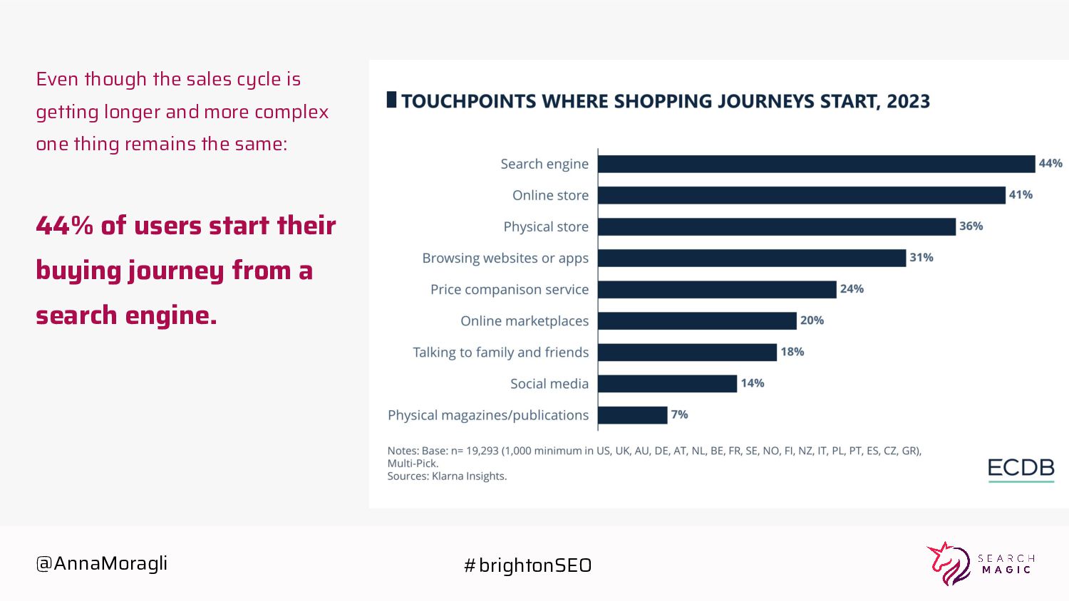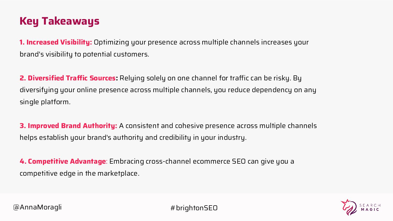 channels increases your brand's visibility to potential customers. 2. Diversified Traffic Sources: Relying solely on one channel for traffic can be risky. By diversifying your online presence across multiple channels, you reduce dependency on any single platform. 3. Improved Brand Authority: A consistent and cohesive presence across multiple channels helps establish your brand's authority and credibility in your industry. 4. Competitive Advantage: Embracing cross-channel ecommerce SEO can give you a competitive edge in the marketplace. @AnnaMoragli #brightonSEO
