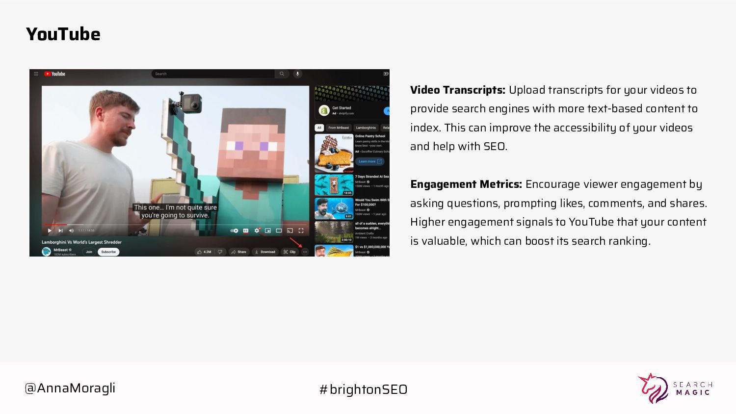 search engines with more text-based content to index. This can improve the accessibility of your videos and help with SEO. Engagement Metrics: Encourage viewer engagement by asking questions, prompting likes, comments, and shares. Higher engagement signals to YouTube that your content is valuable, which can boost its search ranking. @AnnaMoragli #brightonSEO
