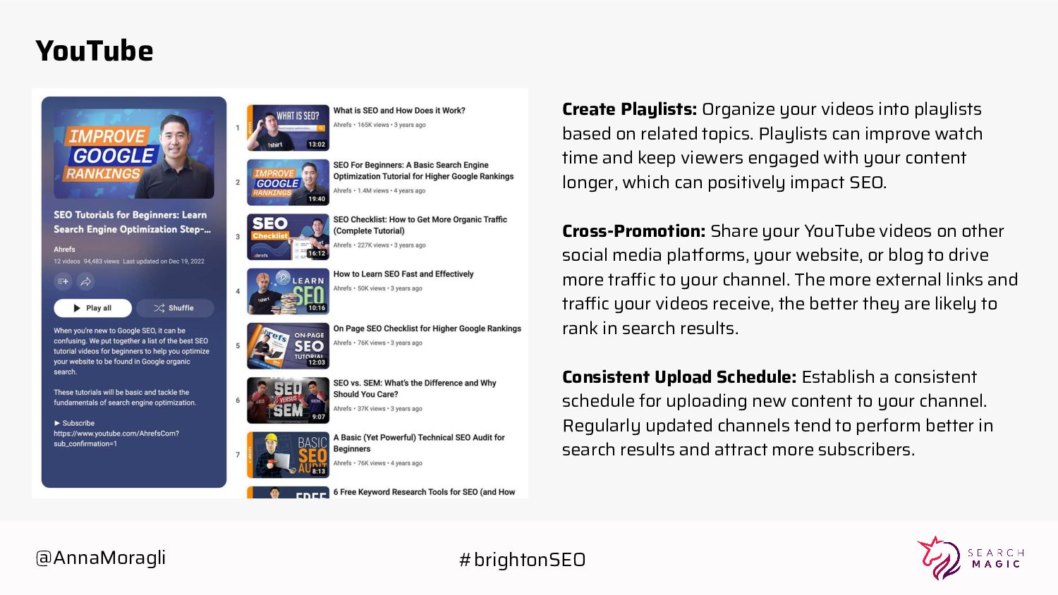related topics. Playlists can improve watch time and keep viewers engaged with your content longer, which can positively impact SEO. Cross-Promotion: Share your YouTube videos on other social media platforms, your website, or blog to drive more traffic to your channel. The more external links and traffic your videos receive, the better they are likely to rank in search results. Consistent Upload Schedule: Establish a consistent schedule for uploading new content to your channel. Regularly updated channels tend to perform better in search results and attract more subscribers. @AnnaMoragli #brightonSEO