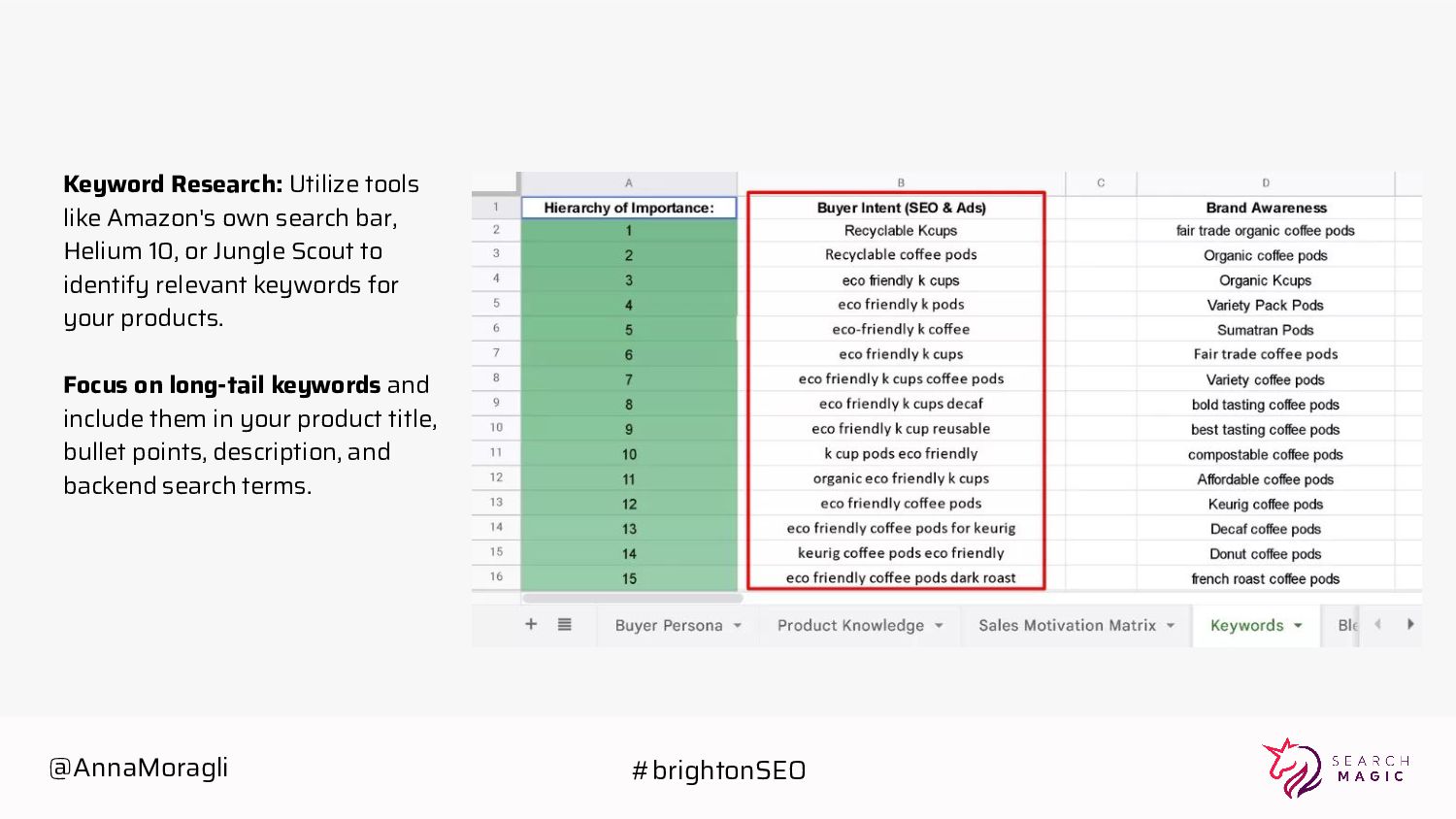 10, or Jungle Scout to identify relevant keywords for your products. Focus on long-tail keywords and include them in your product title, bullet points, description, and backend search terms. @AnnaMoragli #brightonSEO