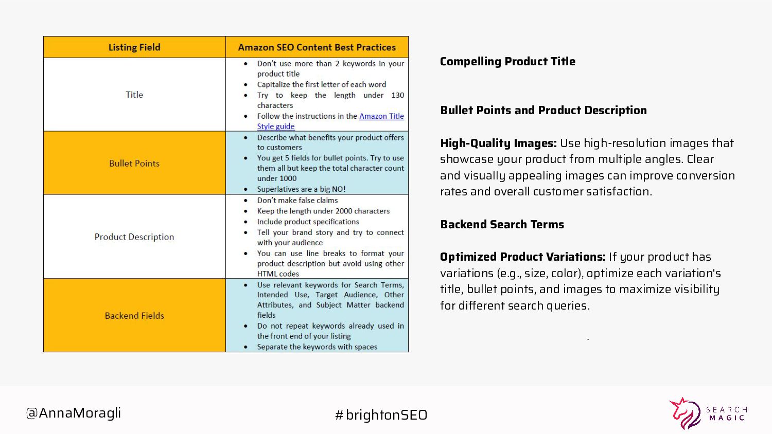 Use high-resolution images that showcase your product from multiple angles. Clear and visually appealing images can improve conversion rates and overall customer satisfaction. Backend Search Terms Optimized Product Variations: If your product has variations (e.g., size, color), optimize each variation's title, bullet points, and images to maximize visibility for different search queries. . @AnnaMoragli #brightonSEO