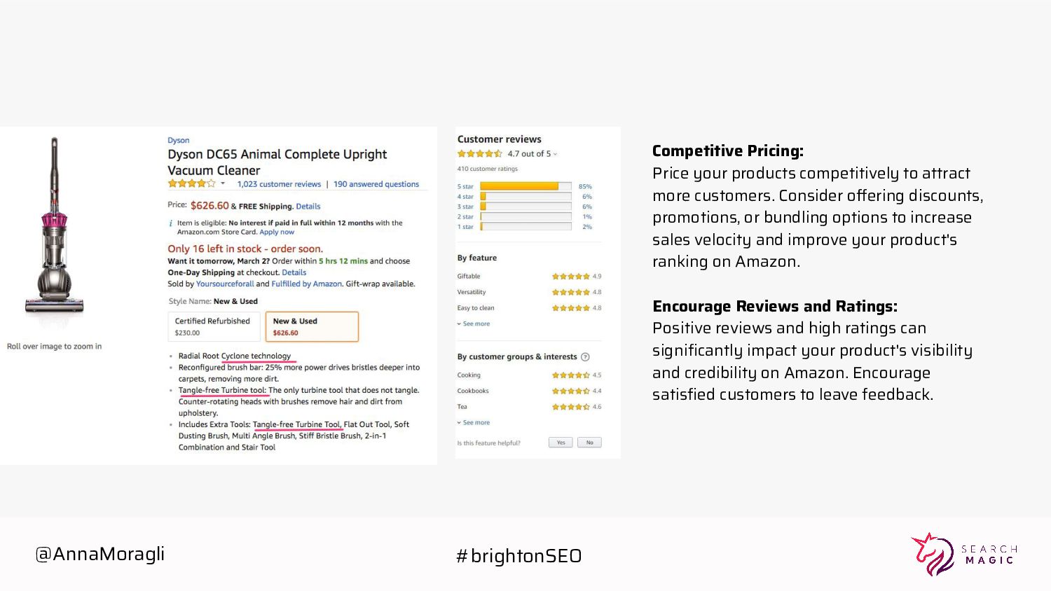 Consider offering discounts, promotions, or bundling options to increase sales velocity and improve your product's ranking on Amazon. Encourage Reviews and Ratings: Positive reviews and high ratings can significantly impact your product's visibility and credibility on Amazon. Encourage satisfied customers to leave feedback. @AnnaMoragli #brightonSEO