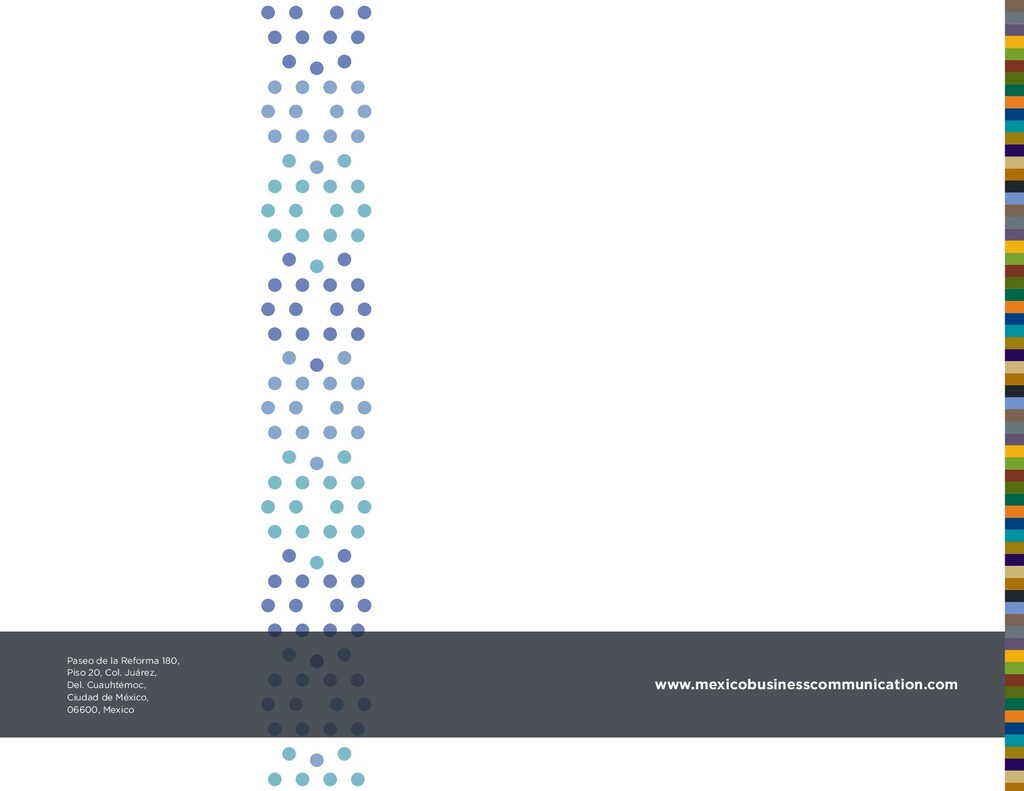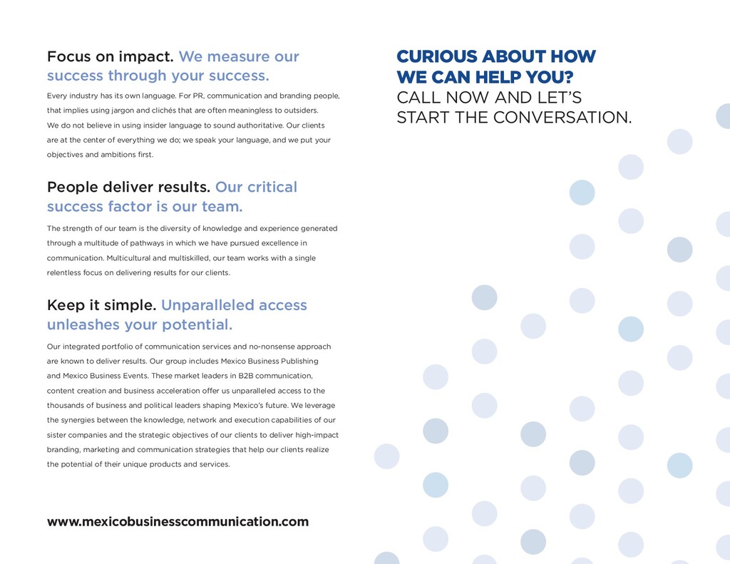 LET’S START THE CONVERSATION. Focus on impact. We measure our success through your success. Every industry has its own language. For PR, communication and branding people, that implies using jargon and clichés that are often meaningless to outsiders. We do not believe in using insider language to sound authoritative. Our clients are at the center of everything we do; we speak your language, and we put your objectives and ambitions first. People deliver results. Our critical success factor is our team. The strength of our team is the diversity of knowledge and experience generated through a multitude of pathways in which we have pursued excellence in communication. Multicultural and multiskilled, our team works with a single relentless focus on delivering results for our clients. Keep it simple. Unparalleled access unleashes your potential. Our integrated portfolio of communication services and no-nonsense approach are known to deliver results. Our group includes Mexico Business Publishing and Mexico Business Events. These market leaders in B2B communication, content creation and business acceleration offer us unparalleled access to the thousands of business and political leaders shaping Mexico’s future. We leverage the synergies between the knowledge, network and execution capabilities of our sister companies and the strategic objectives of our clients to deliver high-impact branding, marketing and communication strategies that help our clients realize the potential of their unique products and services. www.mexicobusinesscommunication.com