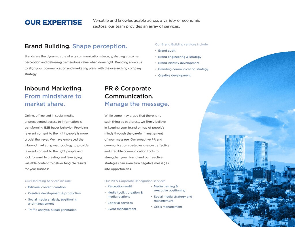 customer perception and delivering tremendous value when done right. Branding allows us to align your communication and marketing plans with the overarching company strategy. Brand Building. Shape perception. Our Brand Building services include: • Brand audit • Brand engineering & strategy • Brand identity development • Branding communication strategy • Creative development OUR EXPERTISE Versatile and knowledgeable across a variety of economic sectors, our team provides an array of services. Inbound Marketing. From mindshare to market share. Online, offline and in social media, unprecedented access to information is transforming B2B buyer behavior. Providing relevant content to the right people is more crucial than ever. We have embraced the inbound marketing methodology to provide relevant content to the right people and look forward to creating and leveraging valuable content to deliver tangible results for your business. Our Marketing Services include: • Editorial content creation • Creative development & production • Social media analysis, positioning and management • Traffic analysis & lead generation PR & Corporate Communication. Manage the message. While some may argue that there is no such thing as bad press, we firmly believe in keeping your brand on top of people’s minds through the careful management of your message. Our proactive PR and communication strategies use cost effective and credible communication tools to strengthen your brand and our reactive strategies can even turn negative messages into opportunities. • Perception audit • Media toolkit creation & media relations • Editorial services • Event management • Media training & executive positioning • Social media strategy and management • Crisis management Our PR & Corporate Recognition services