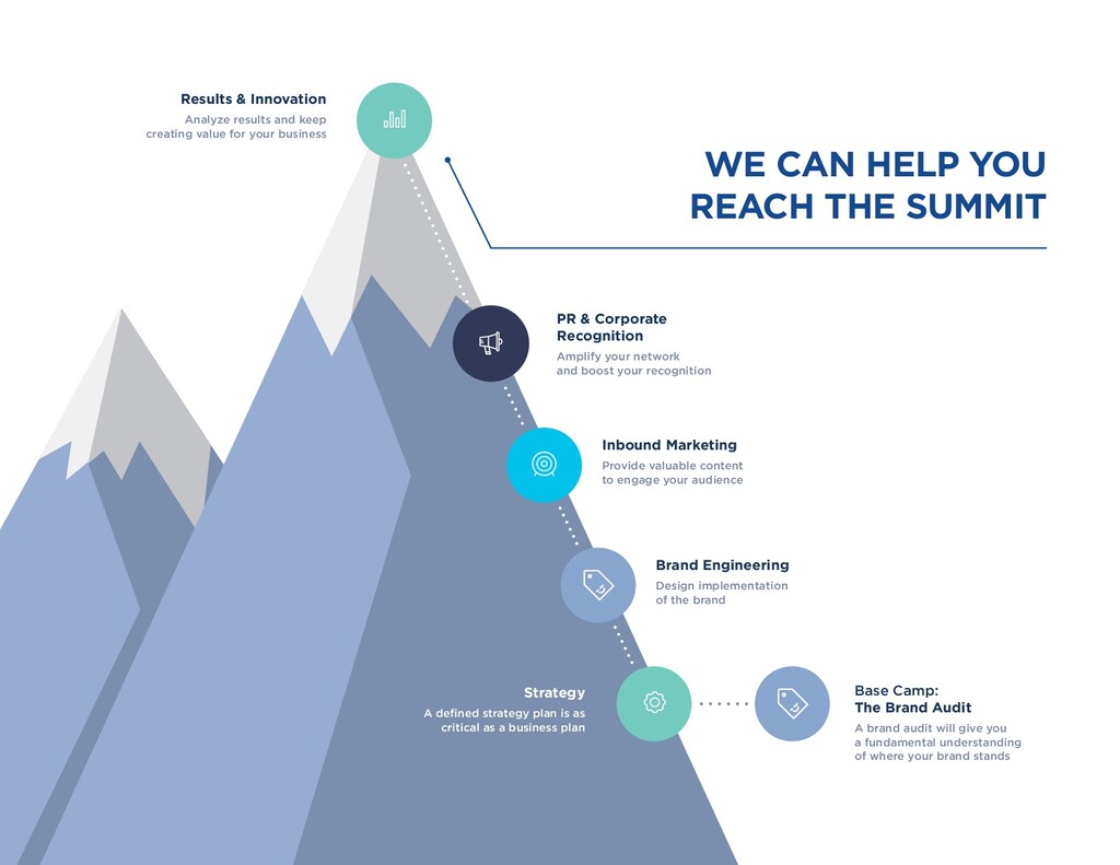 you a fundamental understanding of where your brand stands Brand Engineering Design implementation of the brand Inbound Marketing Provide valuable content to engage your audience Results & Innovation Analyze results and keep creating value for your business PR & Corporate Recognition Amplify your network and boost your recognition Strategy A defined strategy plan is as critical as a business plan WE CAN HELP YOU REACH THE SUMMIT