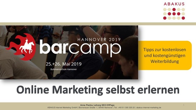 Präsentation von ABAKUS Intertnet Marketing, Anna Pianka, auf dem Barcamp Hannover 2019 zu Online Marketing Basics.