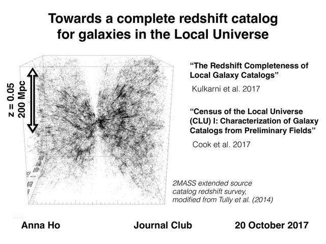 compilation of all public catalogs • 3π of the sky (3626 pointings) in 4 narrowband filters • 234,500 galaxies from compilation • Spectroscopic follow-up of all galaxy candidates with no previous distance information in 14 preliminary fields (0.3% of total pointings) • Of 334 galaxies, 124 really had z < 0.05 Cook et al. 2017: Conducting a Census of the Local Universe (CLU)