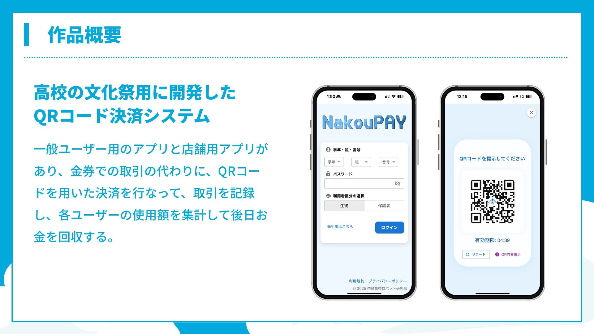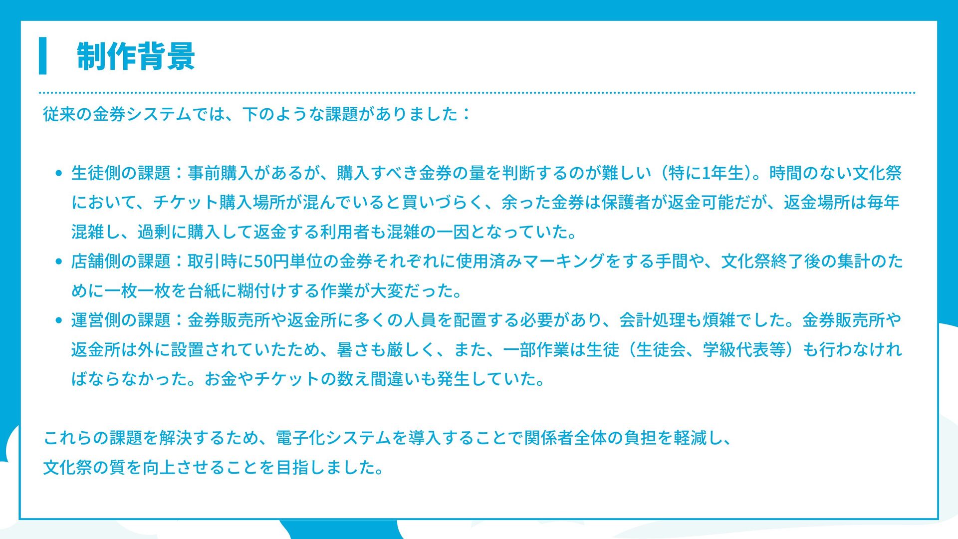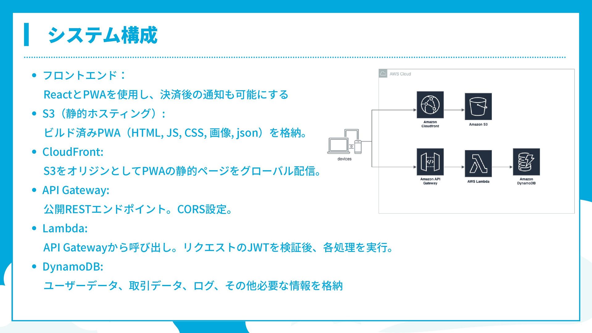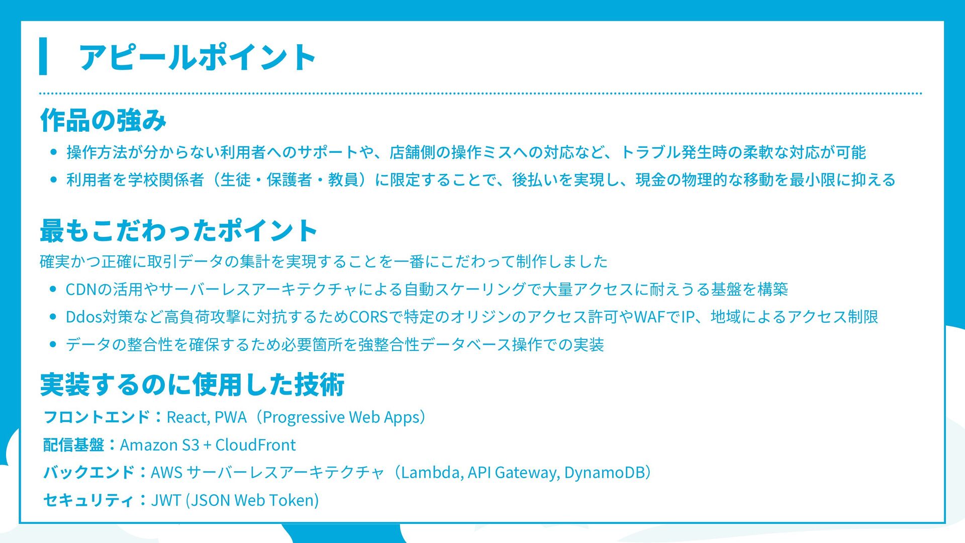 3. アピールポイント 操作方法が分からない利用者へのサポートや、店舗側の操作ミスへの対応など、トラブル発生時の柔軟な対応が可能 利用者を学校関係者(生徒・保護者・教員)に限定することで、後払いを実現し、現金の物理的な移動を最小限に抑える 作品の強み 最もこだわったポイント フロントエンド:React, PWA(Progressive Web Apps) 配信基盤:Amazon