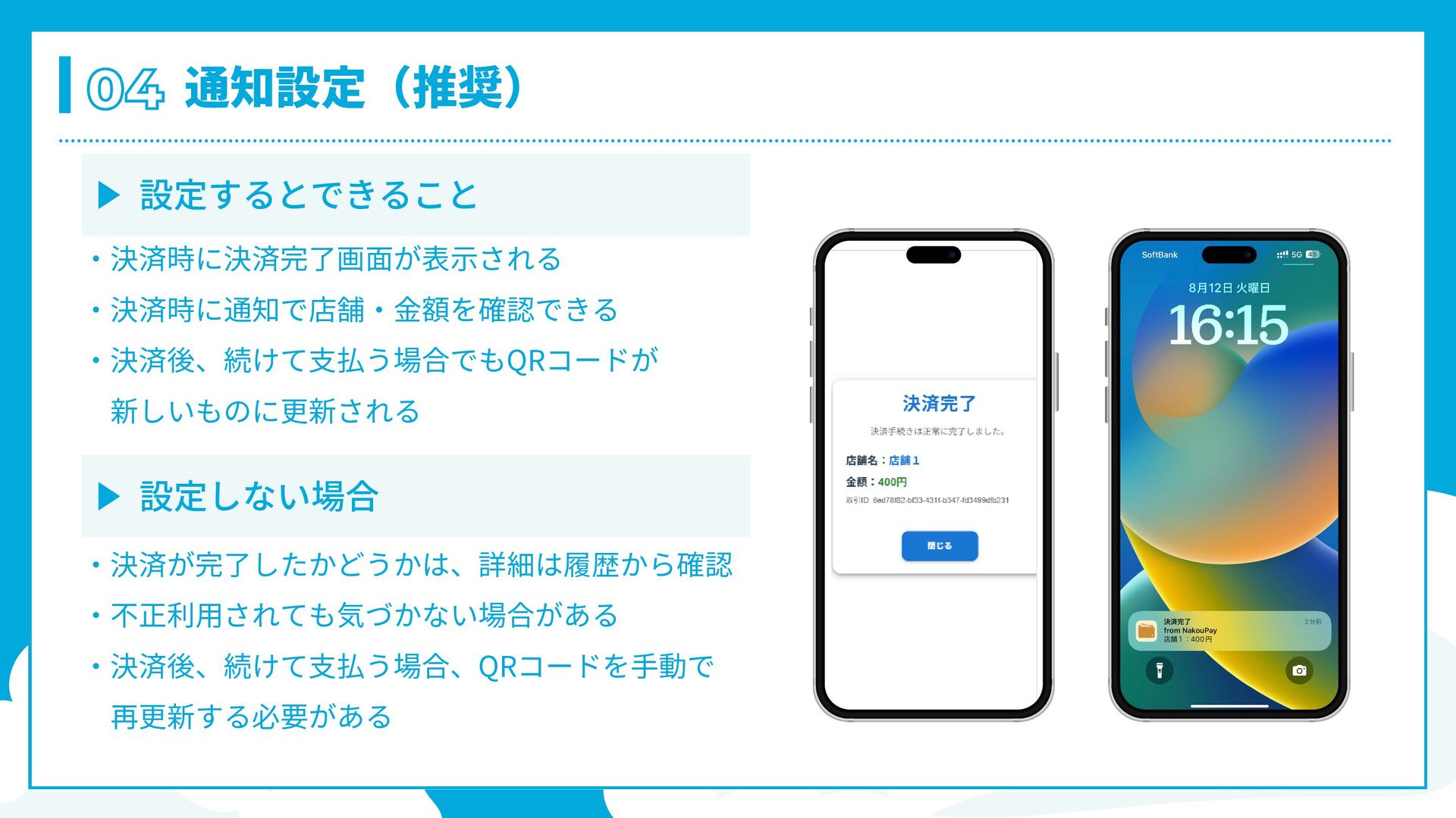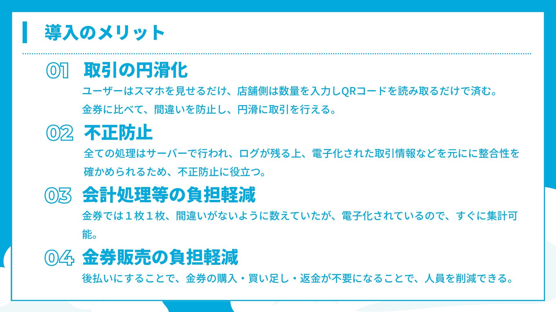 確かめられるため、不正防止に役立つ。 03 03 会計処理等の負担軽減 金券では1枚1枚、間違いがないように数えていたが、電子化されているので、すぐに集計可 能。 04 04 金券販売の負担軽減 後払いにすることで、金券の購入・買い足し・返金が不要になることで、人員を削減できる。